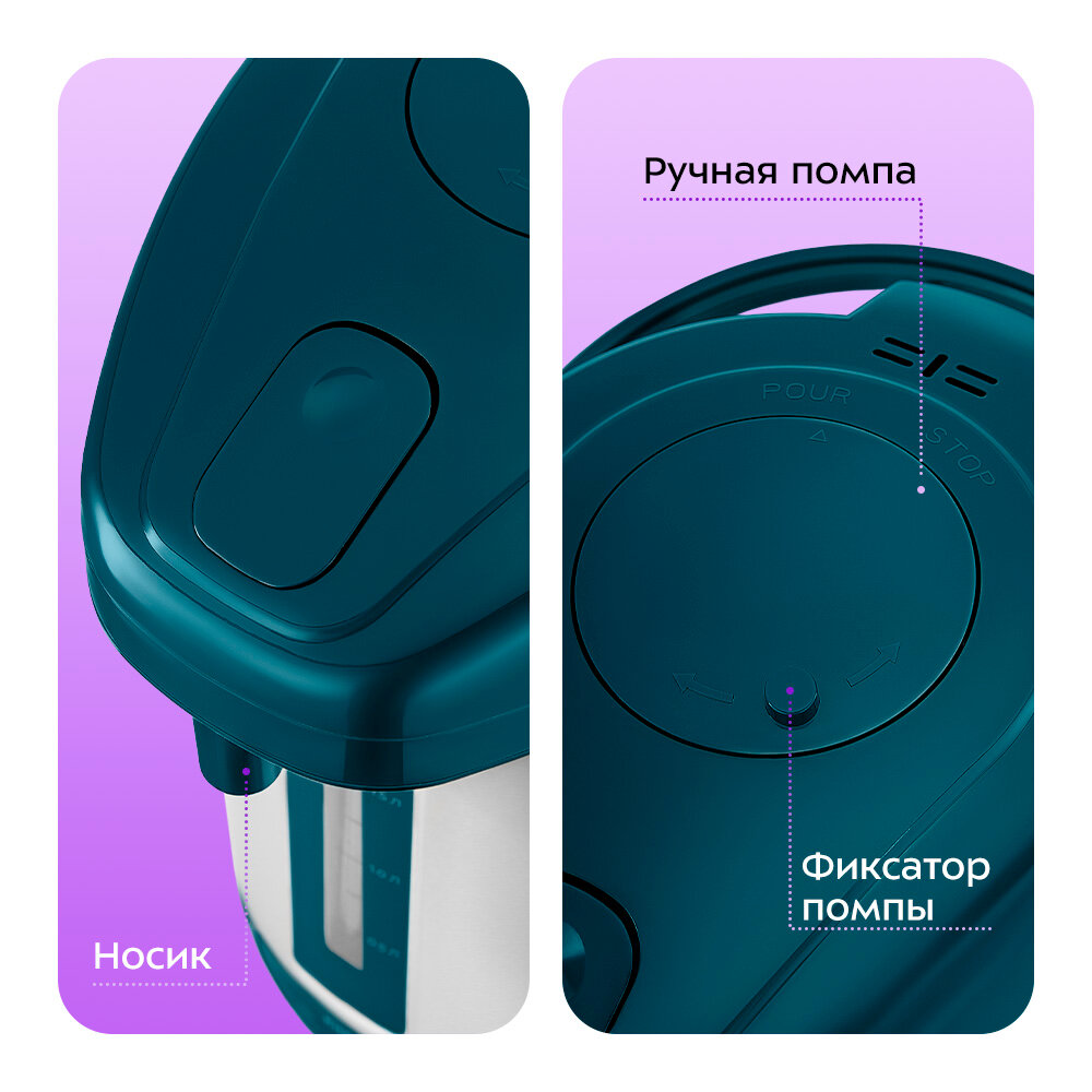 Термопот оснащён ручной помпой. Нажимайте на ручную помпу, чтобы прокачать воду. Поверните фиксатор против часовой стрелки, чтобы разблокировать ручную помпу, по часовой стрелке – чтобы заблокировать.