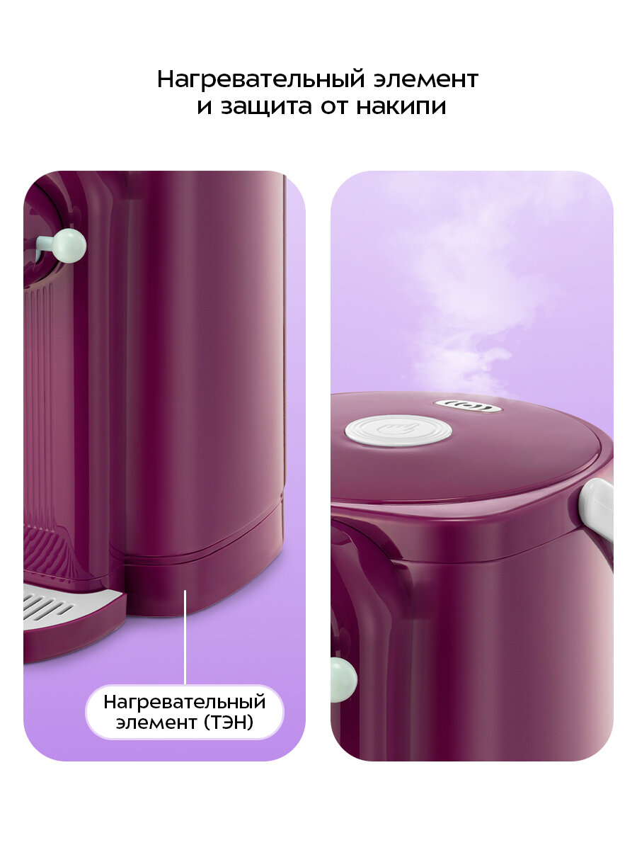 Нагревательный элемент в нижней части термопота закрыт металлической пластиной из нержавеющей стали, предотвращающей прямой контакт с водой и образование накипи. Данная конструкция значительно упрощает уход и делает работу более тихой при нагревании воды.