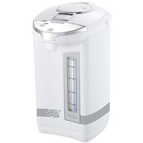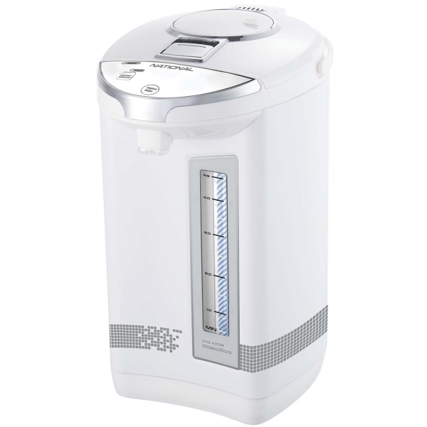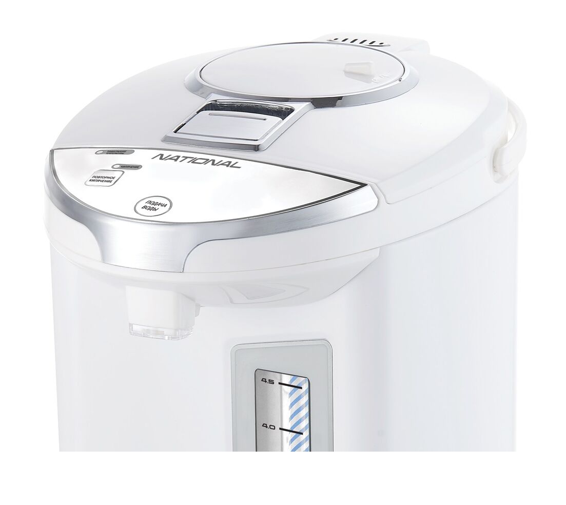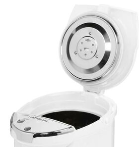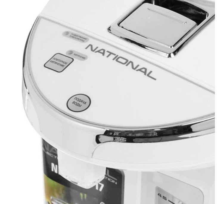 Термопот National NK-TP5017 с мощностью 750 Вт совмещает функции чайника и термоса. Он способен кипятить воду и поддерживать ее высокую температуру на заданном уровне длительное время. Объем резервуара для воды равен 5 л. Вода подается при помощи ручной помпы или электронасоса. Термопот в корпусе из металла и пластика поддерживает три режима работы: кипячение, повторное кипячение и поддержание температуры.