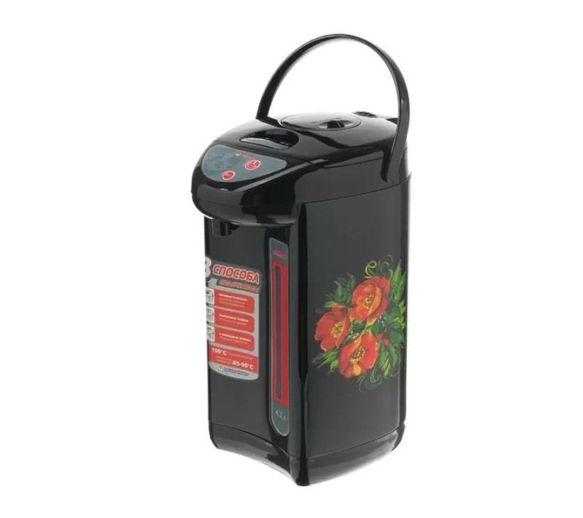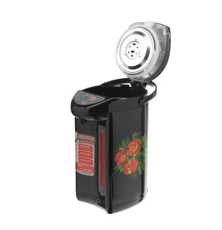 Чайник-термос с функцией кипячения и поддержания температуры на уровне 85-90ºС. Двойная защита от перегрева и включения без воды. Три способа подачи воды. Поворот основания на 360º. Световые индикаторы кипячения и поддержания тепла. Съёмная крышка для очистки термопота.