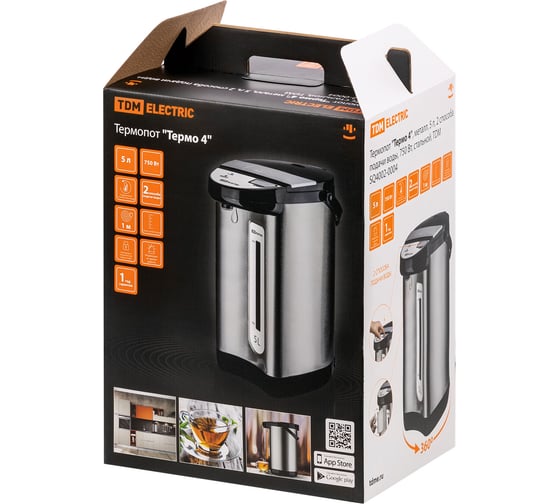Термопот TDM ELECTRIC Термо 4, металл, 5 л, 2 способа подачи воды, 750 Вт, стальной SQ4002-0004 предназначен для бытового применения.