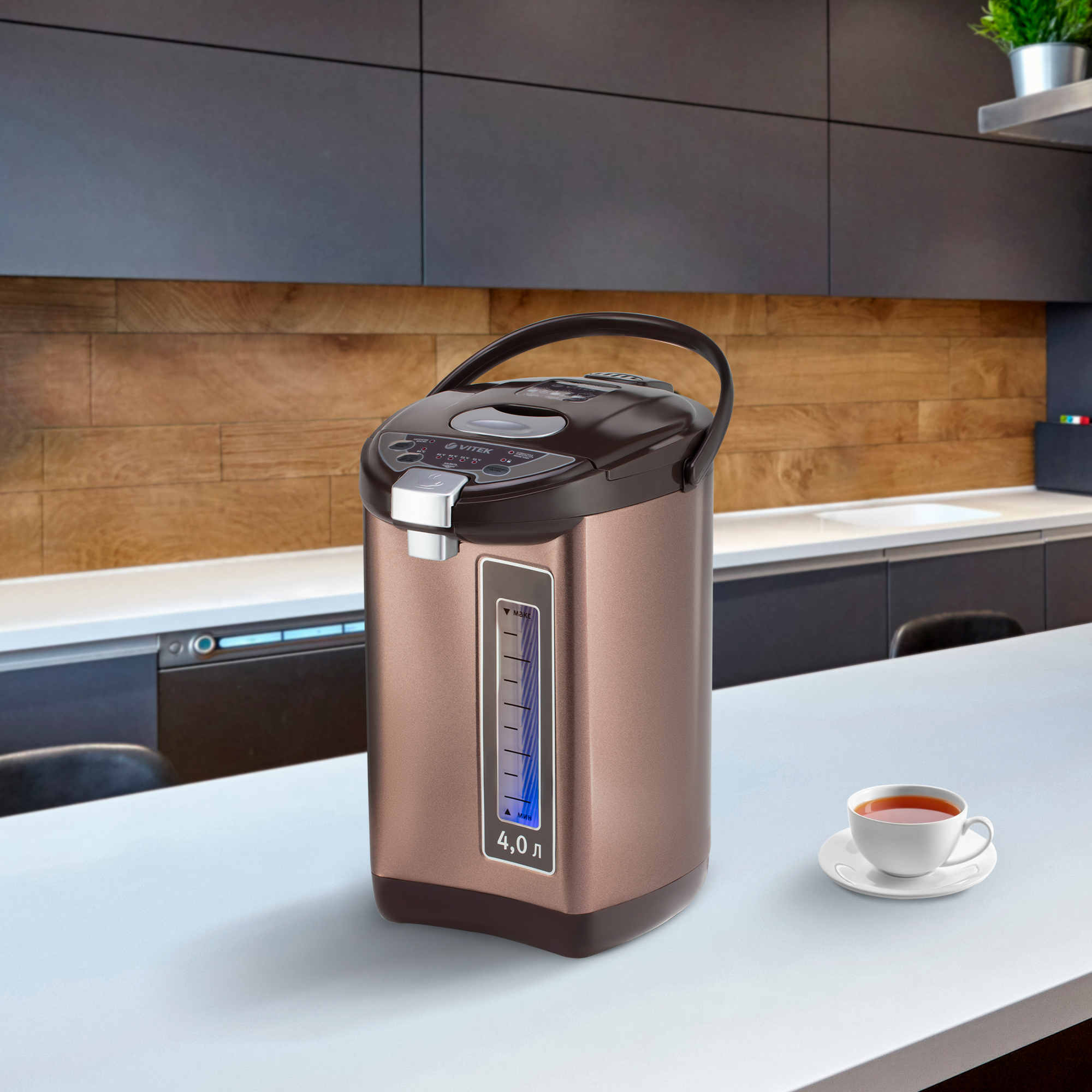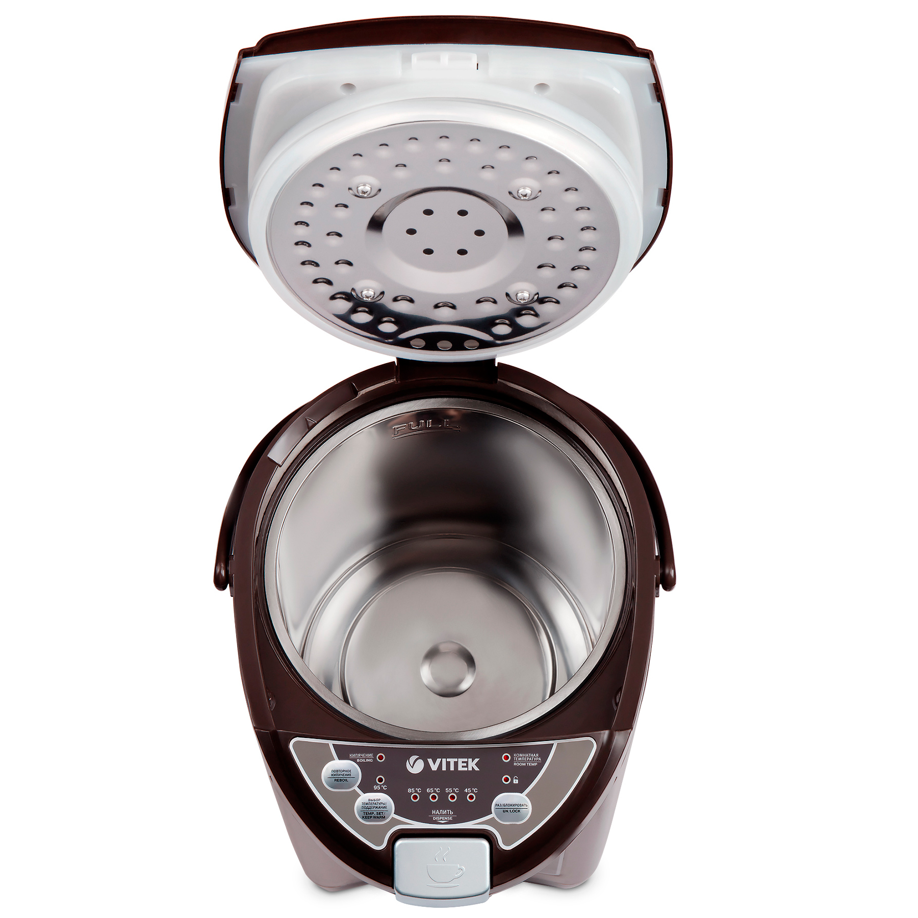 С помощью термопота VITEK VT-1190 с максимальной мощностью 1200 Вт можно быстро вскипятить большой объем воды (до 4 л) и сохранить ее в горячем виде в течение всего дня. Температуру (45 °С/55 °/65 °С/85 °С/95 °С) выбирайте на ваше усмотрение. Налить воду из термопота можно нажав на специальный клапан или воспользоваться режимом подачи через автоматическую помпу.