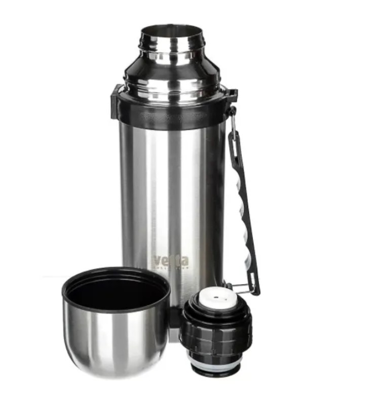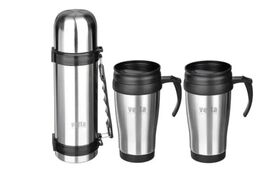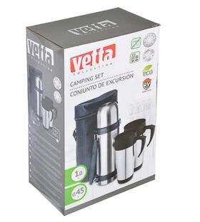 Походный набор упакован в удобную сумку черного цвета состоит из термоса 1 л с металлической колбой и в корпусе из нержавеющей стали серебристого цвета с пластиковой ручкой, с завинчивающейся пластиковой пробкой и с крышкой. Также в наборе две термос-кружки объемом 450мл из нержавеющей стали с ручкой из черного пластика, укомплектованных черными пластиковыми крышками.