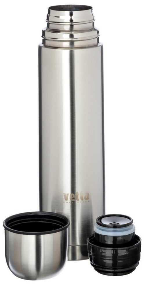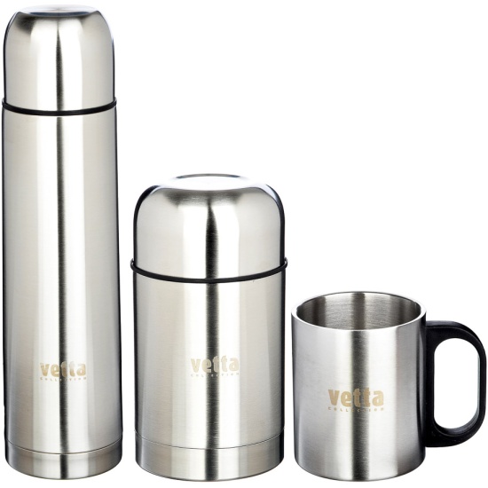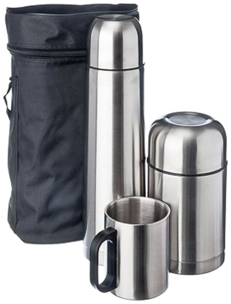 Походный набор упакован в удобную сумку черного цвета и состоит из термосов 1 л и 0,75 л с металлической колбой и в корпусе из нержавеющей стали серебристого цвета, с завинчивающейся пластиковой пробкой и с крышкой. Также в наборе есть термос-кружка объемом 300 мл из нержавеющей стали с пластиковой ручкой.