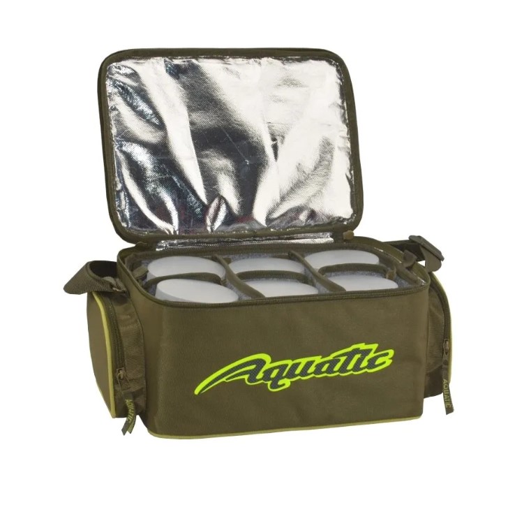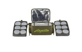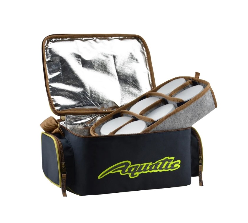 Термо-сумка Aquatic С-43 с банками для хранения дипов и насадок. Термо-сумка полностью выполнена из высококачественного износостойкого нейлона и имеет прорезиненное дно, благодаря чему практически не промокает и легко отмывается от загрязнений. Для максимально длительного хранения ваших дипов и насадок весь внутренний объем термо-сумки покрыт технологичным термоизоляционным материалом. Термо-сумка укомплектована 12-ю банками диаметром 89 мм и высотой 60 мм, размещенными в двух специальных съемных отделениях с мягкими перегородками на липучках, которые позволяют подгонять размеры ячеек для банок другого объема. Верхняя крышка на молнии имеет вместительный формованный карман, в котором можно хранить рыболовную коробку, или другие полезные аксессуары. По бокам расположены два объемных кармана на молнии для различных рыболовных принадлежностей. Для удобства транспортировки термо-сумка имеет регулируемый по высоте плечевой ремень из прочной стропы.