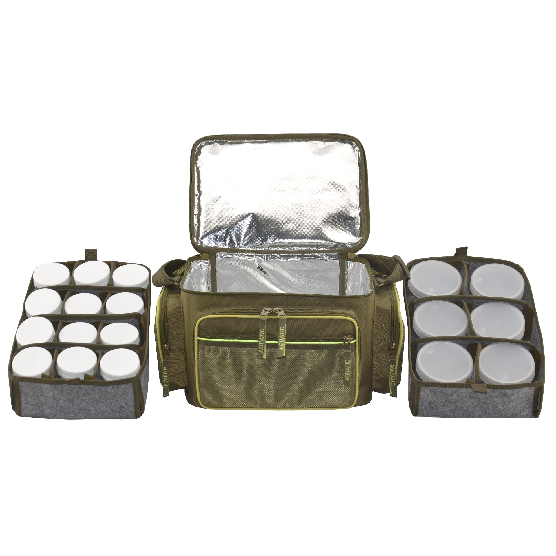 Термо-сумка Aquatic С-44 с банками для хранения дипов и насадок. Термо-сумка полностью выполнена из высококачественного износостойкого нейлона и имеет прорезиненное дно, благодаря чему практически не промокает и легко отмывается от загрязнений. Для максимально длительного хранения ваших дипов и насадок весь внутренний объем термо-сумки покрыт технологичным термоизоляционным материалом. Термо-сумка укомплектована 6-ю банками диаметром 89 мм и высотой 80 мм и 12-ю банками диаметром 58 мм и высотой 100 мм, размещенными в двух специальных съемных отделениях с мягкими перегородками на липучках, которые позволяют подгонять размеры ячеек для банок другого объема. Верхняя крышка на молнии имеет вместительный формованный карман, в котором можно хранить рыболовную коробку, или другие полезные аксессуары. Спереди и по бокам расположены три объемных кармана на молнии с накладными карманами из сетки для различных рыболовных принадлежностей. Для удобства транспортировки термо-сумка имеет регулируемый по высоте плечевой ремень из прочной стропы.