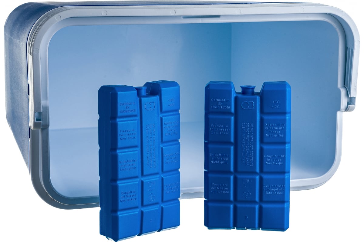 Изотермический контейнер с аккумуляторами холода применяется для хранения и транспортировки еды и напитков. Емкость идеально подходит для поездок за город на отдых. Контейнер надежно удерживает внутреннюю температуру в течение длительного времени. Аккумуляторы предварительно кладут в холодильник, а затем размещают в любом месте, внутри контейнера. Они увеличивают срок хранения продуктов питания. Размеры данной модели: 39х24х39 см.