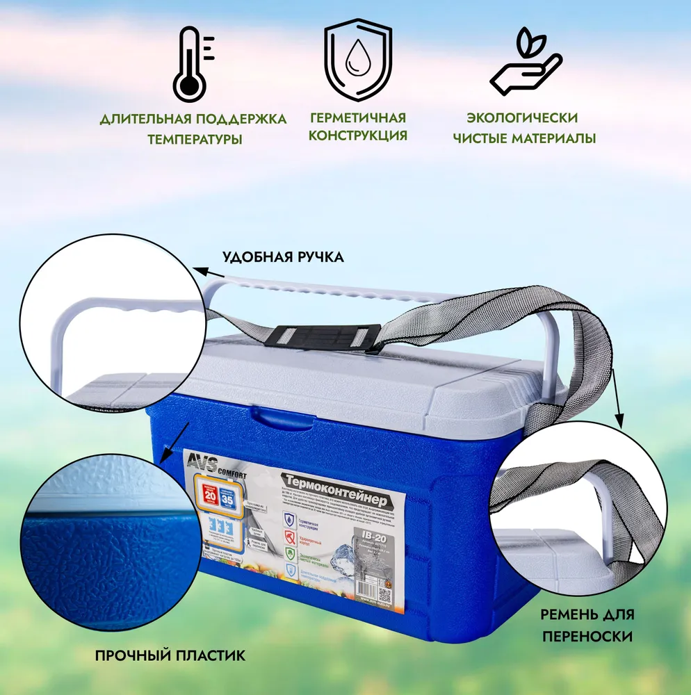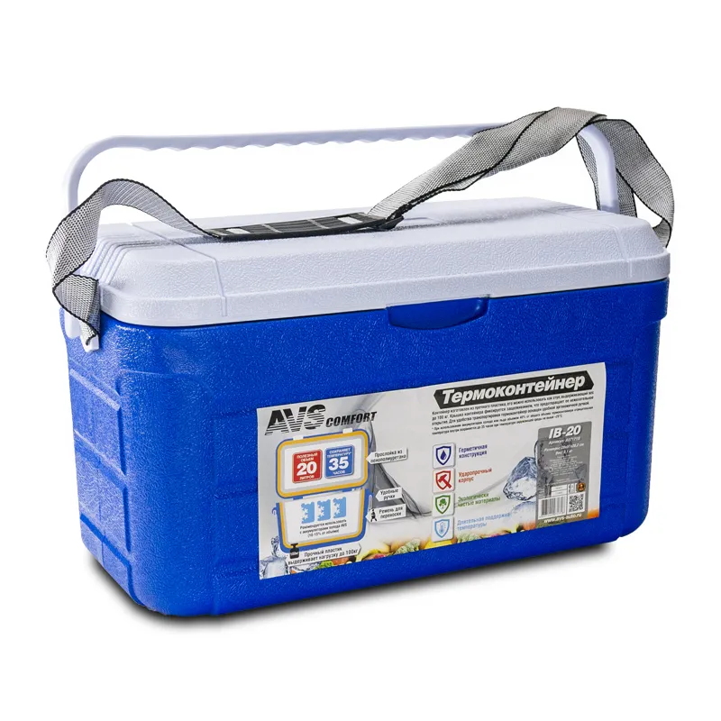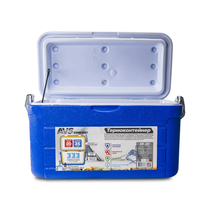 Контейнер AVS IB-20 изготовлен из прочного пластика, его можно использовать как стул, выдерживающий вес до 100 кг. Для удобства транспортировки помимо ручки присутствует ремень. При использовании аккумуляторов холода или льда объемом 40% от общего объема термоконтейнера отрицательная температура внутри сохраняется до 35 часов при температуре окружающей среды не выше +25°С.