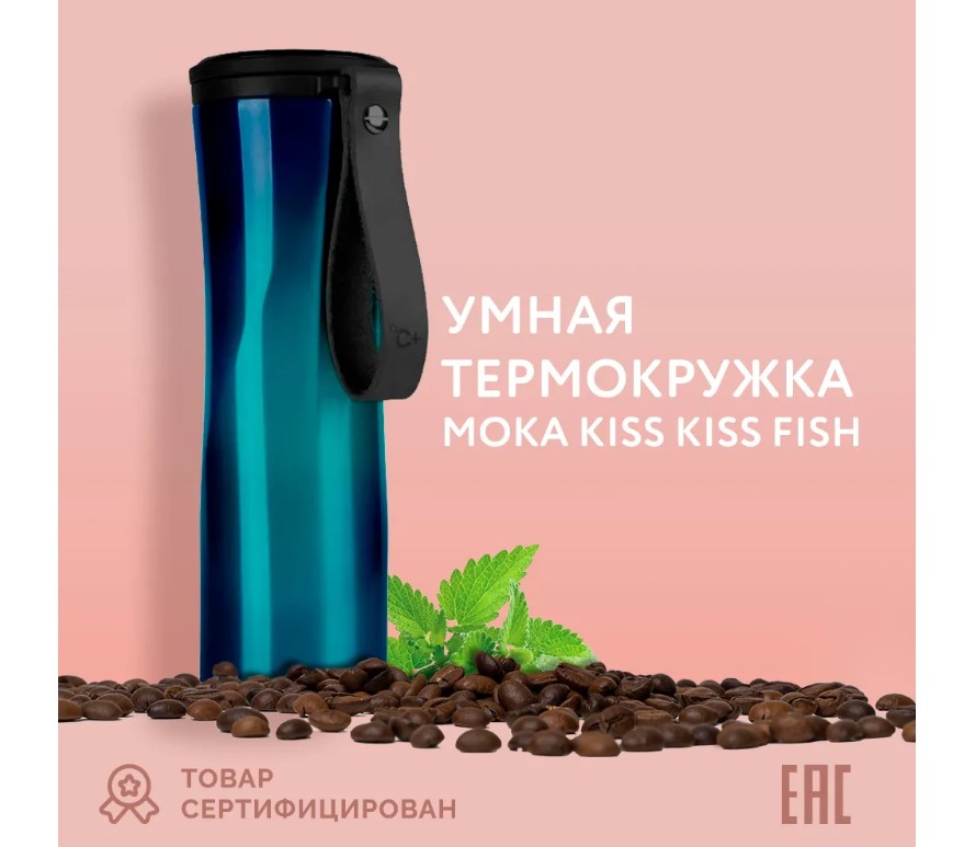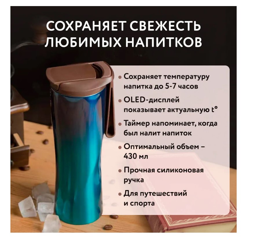 Объем термокружки составляет 430 мл. На крышке имеется сенсорный OLED-экран, на котором выводится информация о температуре и объеме налитой внутрь жидкости. Он работает от батарейки CR2032, срок службы которой — до 12 месяцев в режиме ожидания. Также имеется функция таймера.