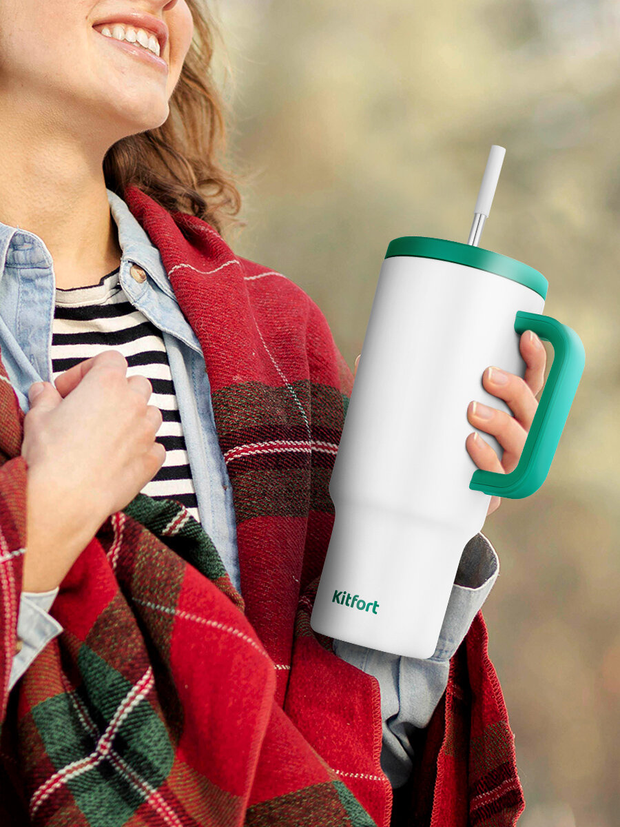 Для удобной переноски у термокружки есть пластиковая ручка, которая не нагревается и удобно лежит в руке. В крышке есть специальное отверстие для питья, в которое вставляется трубка, поэтому пить напитки будет очень удобно.