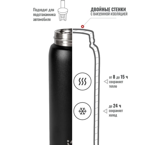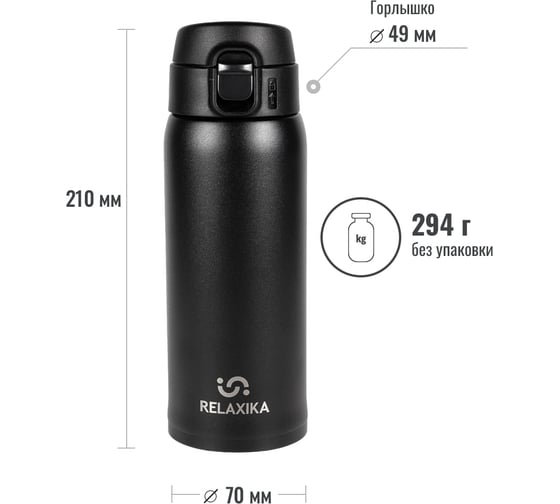 Термокружка Relaxika 701 0.48 л, черная R701.480.2L1 подходит для ежедневного использования дома, на кухне, на даче, на работе. А также во время занятий спортом. Благодаря вакуумной изоляции сохранит ваши напитки горячими или холодными в течение нескольких часов.