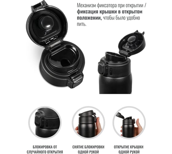 У термокружки есть замок открытия/закрытия. Благодаря такому замку вы можете использовать кружку одной рукой на ходу, что очень удобно в дороге, на прогулке и в путешествиях.