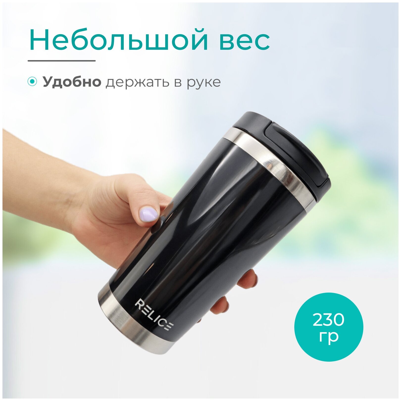 Термокружка черного цвета с горлышком диаметром 8 см отличается вместимостью 400 мл. Крышка с резьбовым креплением плотно фиксируется на основании, чем достигается герметичность. Наличие клапана обеспечивает удобство питья и предотвращает случайное протекание жидкости.