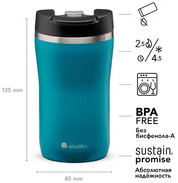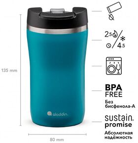 Крышка оснащена двумя прокладками и имеет замок Leak-Lock для предотвращения случайного открытия и разлива напитка. Вакуумная изоляция Thermavac (нержавеющая сталь с двойными стенками) обеспечивает длительное сохранение температуры напитка прохладной до 4,5 часов и горячей - до 2,5 часов.