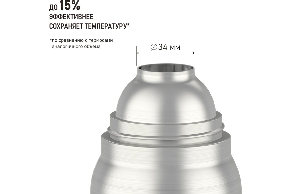 Узкая горловина термоса 34 мм эффективно сохраняет температуру.
