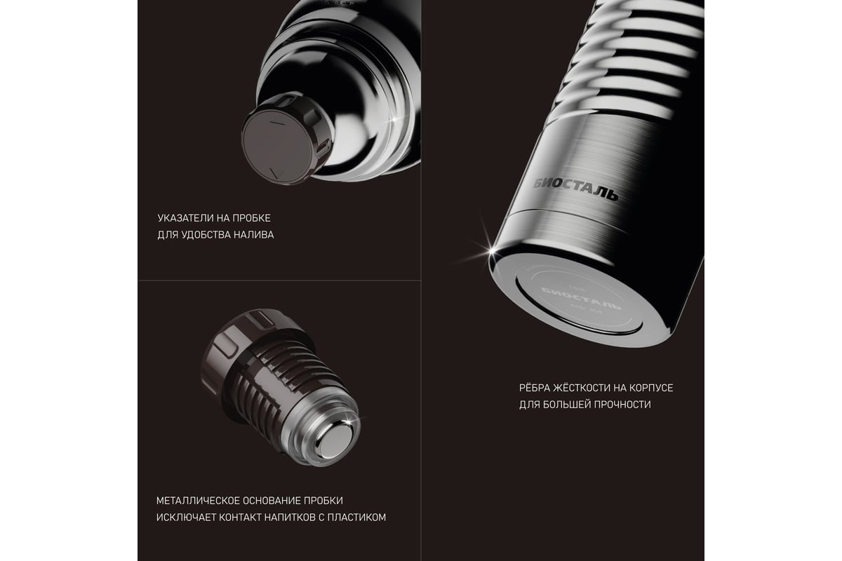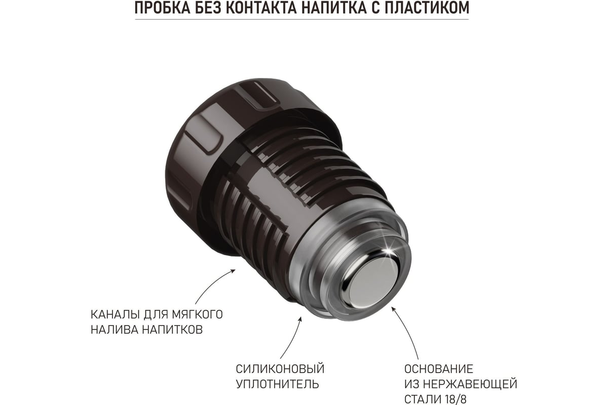 Стальное основание пробки исключает контакт напитка с пластиком.
