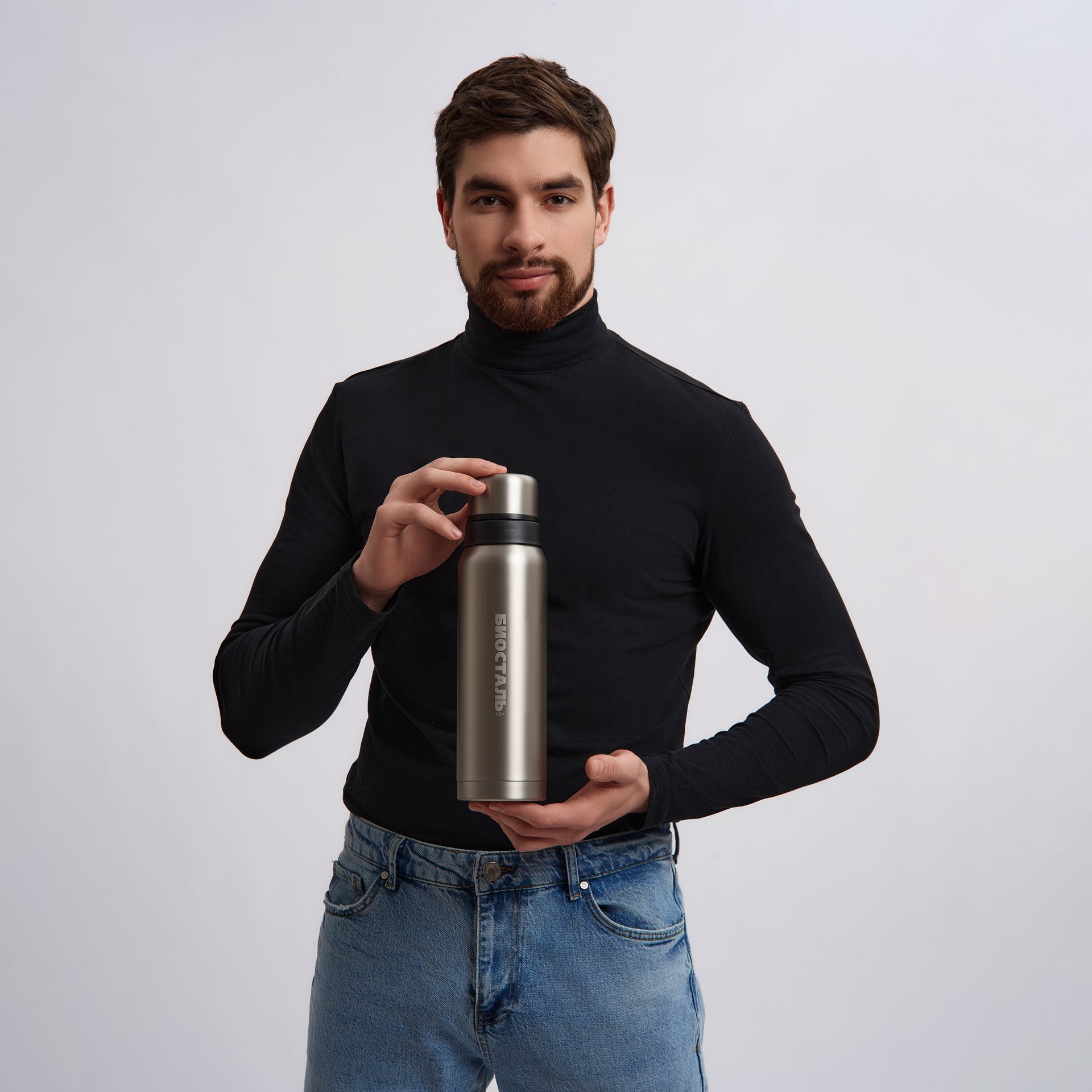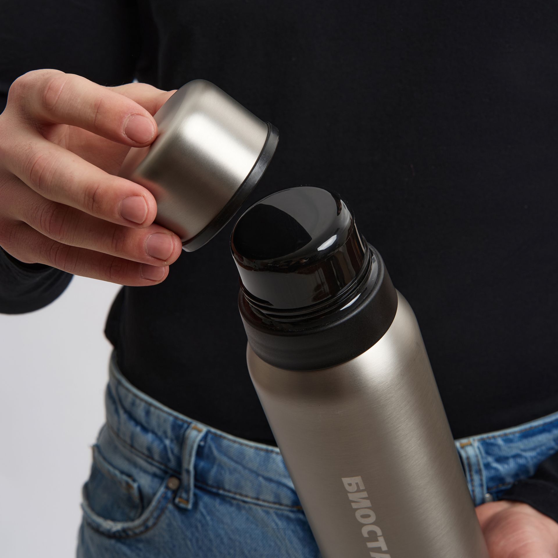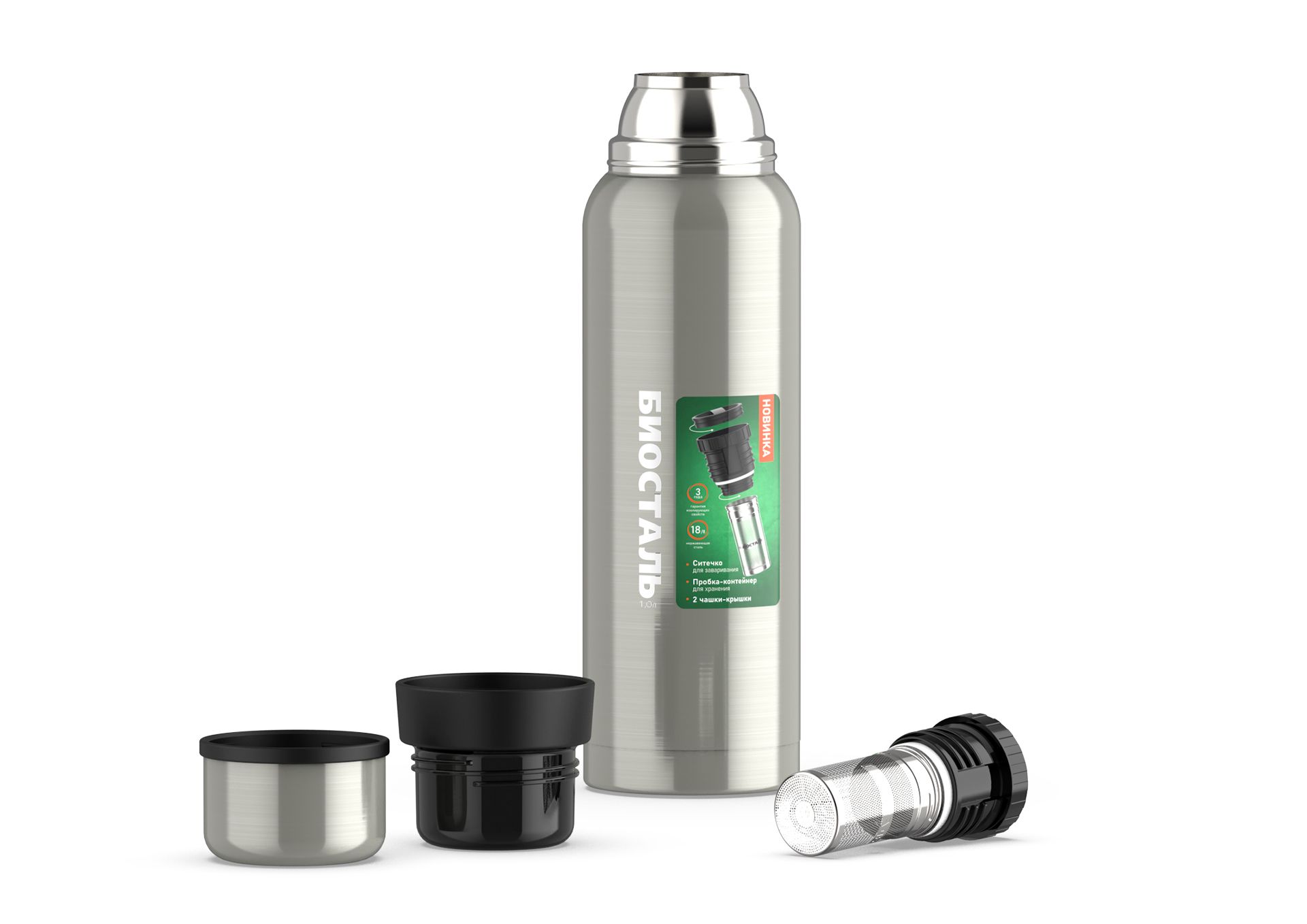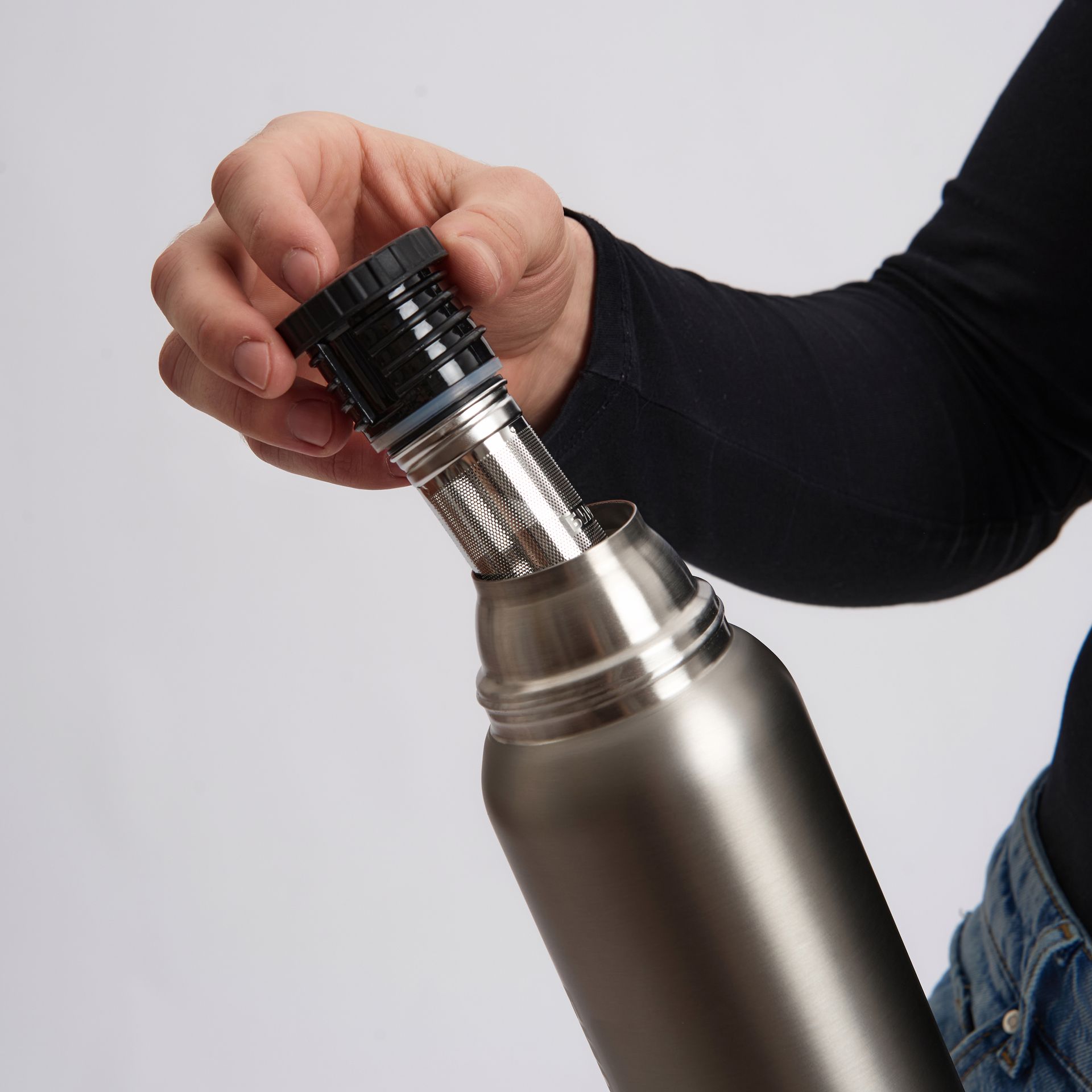 Литровый термос с узким корпусом, с ситечком для заваривания и пробкой-контейнером для хранения. Пробка с функцией «термоконтроль» позволяет наливать напитки без полного откручивания пробки под любым углом.