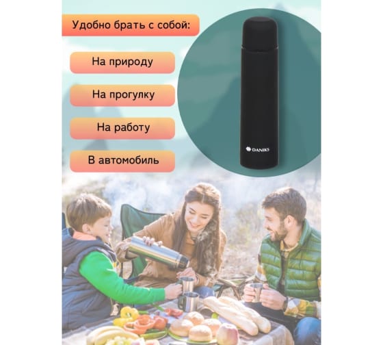 Термоc Daniks обладает высоким качеством, надежностью, компактными размерами и эстетичным дизайном. Горячее остается горячим, а холодное - холодным. Такой термос станет незаменимым в машине, на отдыхе или в путешествии.