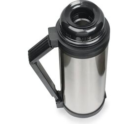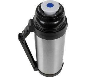 Термос диаметром 10,5 см и высотой 33 см выполнен в серебристом цвете.