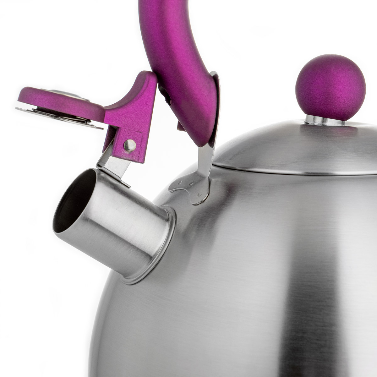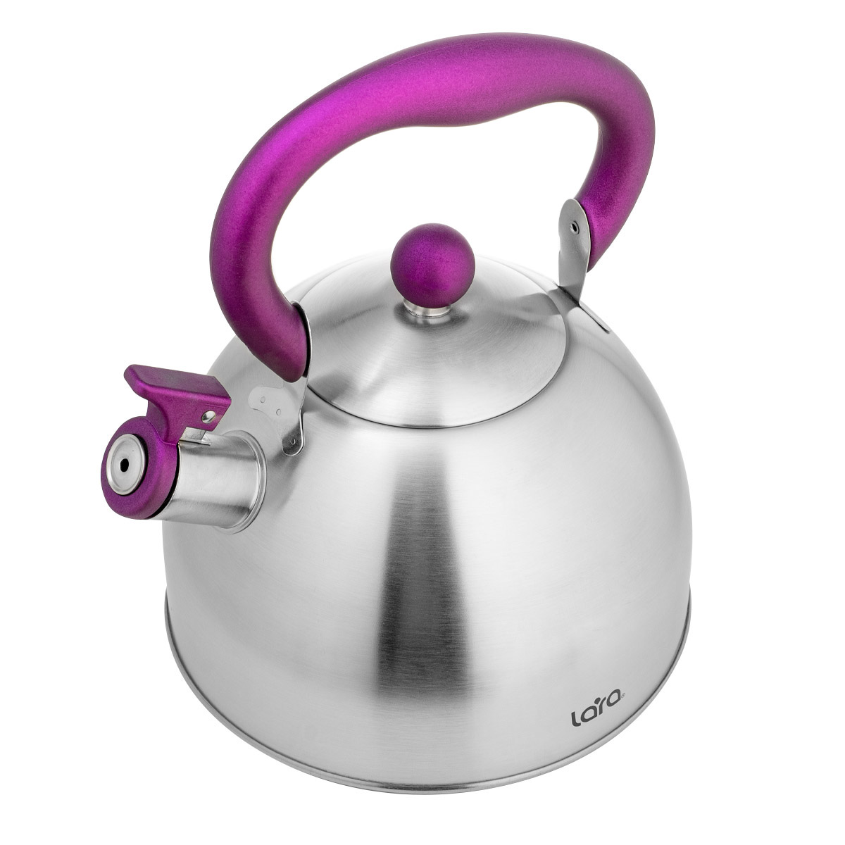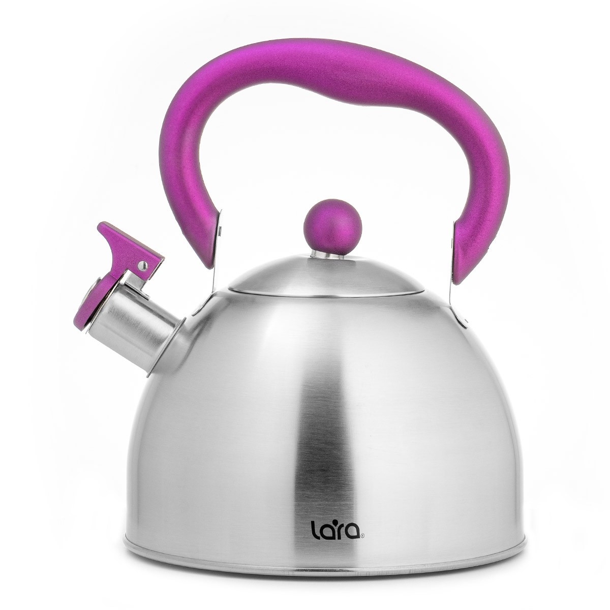 Компактный чайник классической формы LARA со свистком. Матовая полировка корпуса в тандеме с пурпурной отделкой ручек станет ярким акцентом в интерьере вашей кухни. Установленный свисток не позволит пропустить момент закипания воды, и вы вовремя снимите чайник с плиты. Чайник изготовлен из качественной нержавеющей стали. Ручка из ненагревающегося нейлона имеет приятное на ощупь покрытие Soft-touch. Стильная ненагревающаяся крышка с пластиковой ручкой дополняет внешний вид. Свисток на носике открывается с помощью рычага. Индукционное капсулированное дно подходит для всех типов плит.