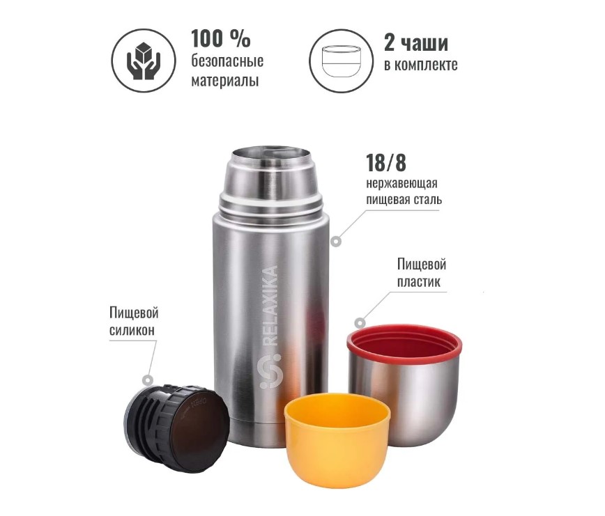 Классический термос Relaxika с двумя чашками и высокими показателями удержания температуры напитка для походов, путешествий, спорта и ежедневного использования. Прочные двойные стенки из высококачественной нержавеющей стали 18/8 с вакуумной изоляцией гарантируют, что ваш напиток останется холодным в течение 34 часов и горячим до 28 часов. Этот материал не только прочен, но и гигиеничен, не выделяет никаких вредных для здоровья веществ. Ваши напитки сохраняет естественный вкус и не приобретут посторонний запах.