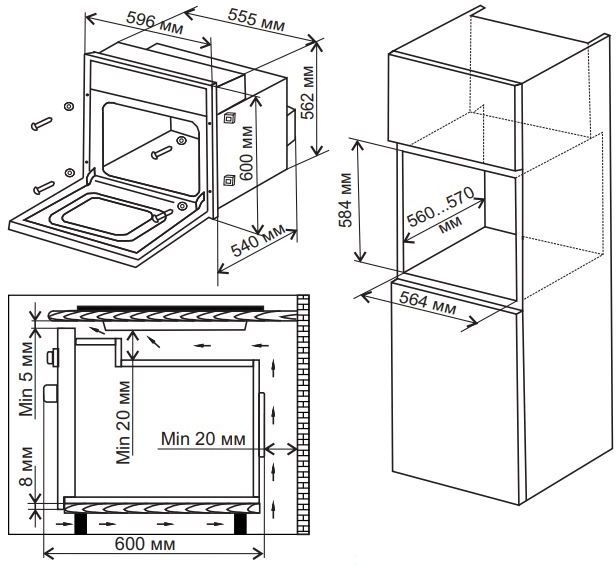 Дверца | Открывание | сверху вниз | Кол-во стекол дверцы | 2 |  |  | Общее | Направляющие противней | решетчатые | Класс энергопотребления | A+ | Мощность подключения | 3.1 кВт | Габариты (ВхШхГ) | 60x59.6x54 см | Размеры для встраивания (ВхШхГ) | 584x564x560 мм |