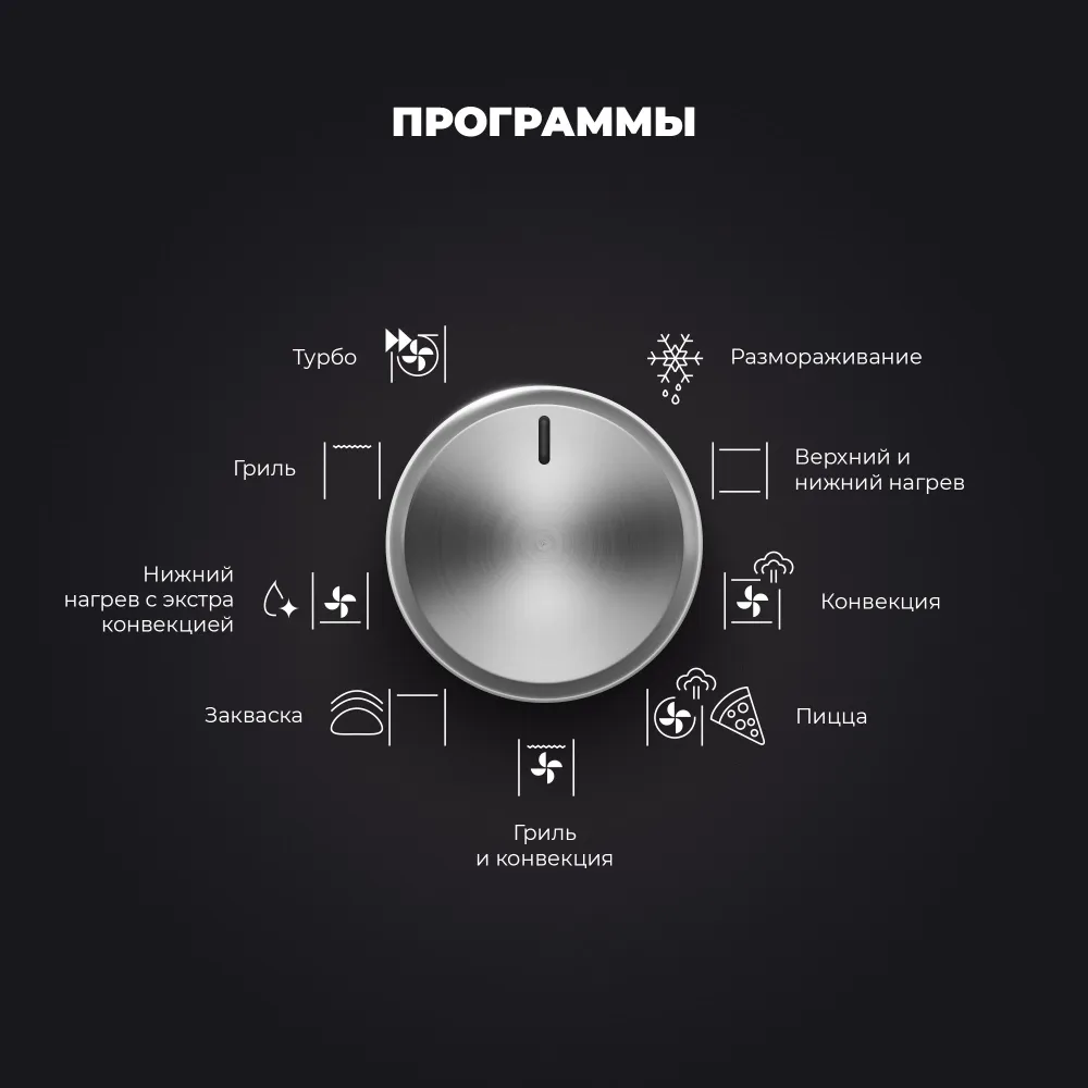 Режимы работы: Конвекция, Гриль, Размораживание, Турбо режим, Нижний нагрев, Верхний нагрев + конвекция, Нижний нагрев + конвекция, Гриль + конвекция, Нижний нагрев + Турбо (Пицца)