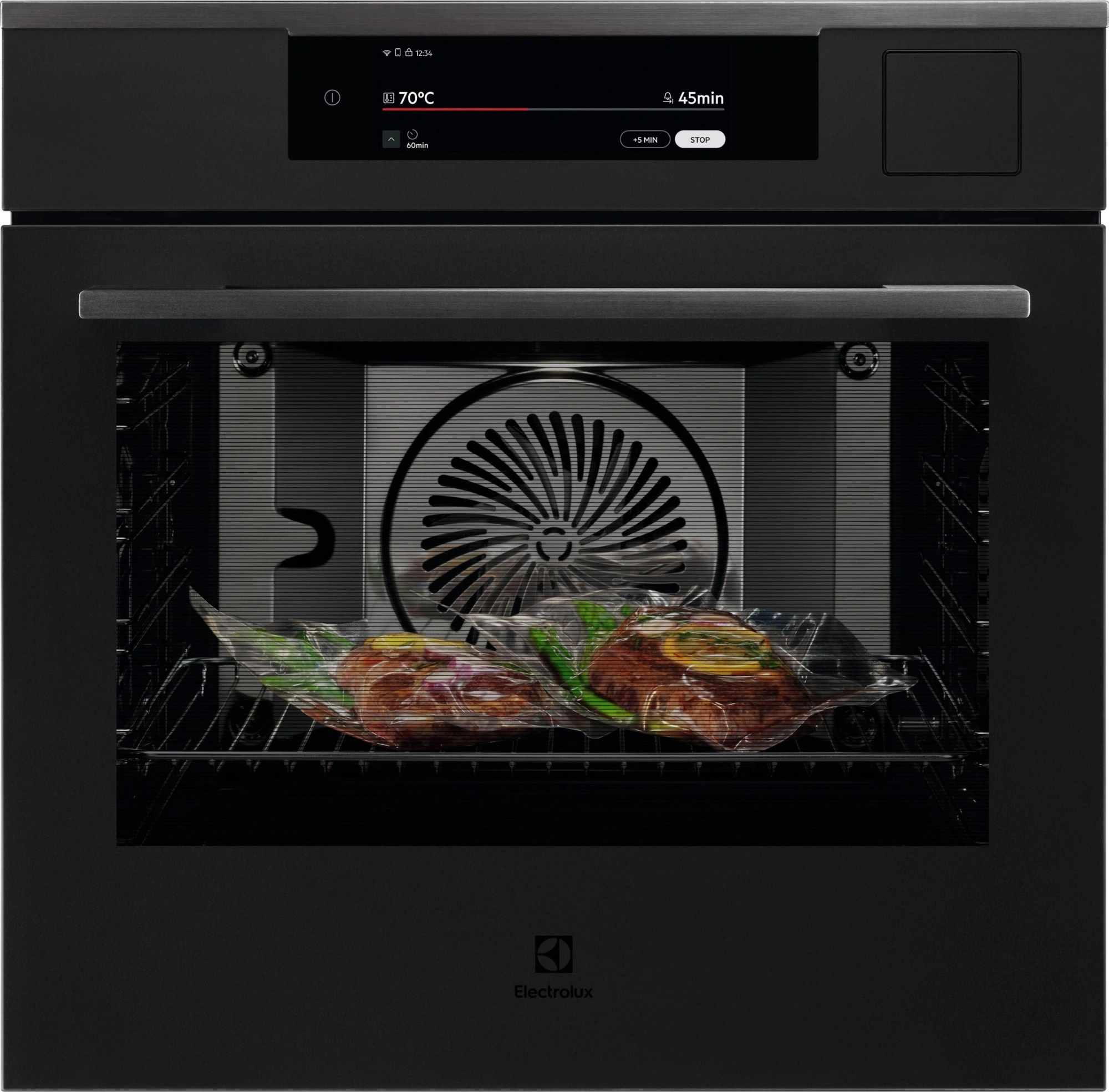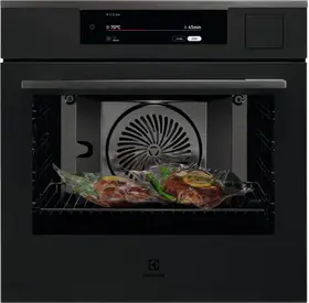 вентилятор охлаждения, двухуровневое освещение, дисплей, полностью стеклянная внутренняя поверхность дверцы духовки, термощуп