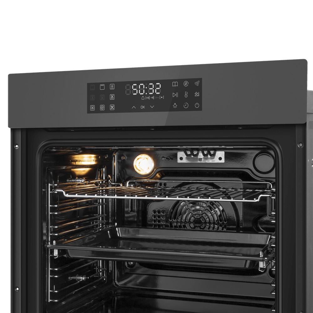 Объем 76 л при стандартных размерах 60 см позволяет готовить одновременно несколько блюд, разместив решетку или противень на одном из 6 уровней боковых направляющих. Два уровня оснащены удобными телескопическими направляющими. Внутреннее покрытие камеры выполнено из специальной легкоочищающейся эмали черного цвета.