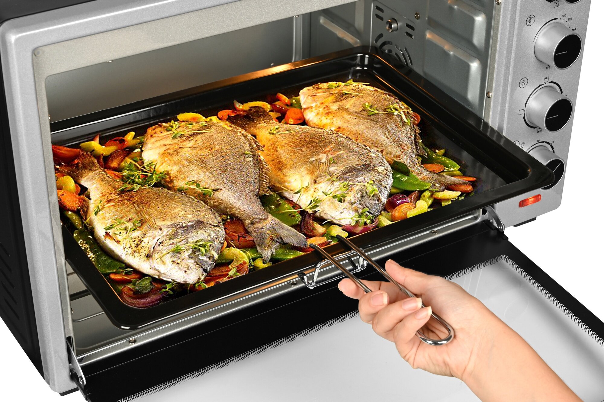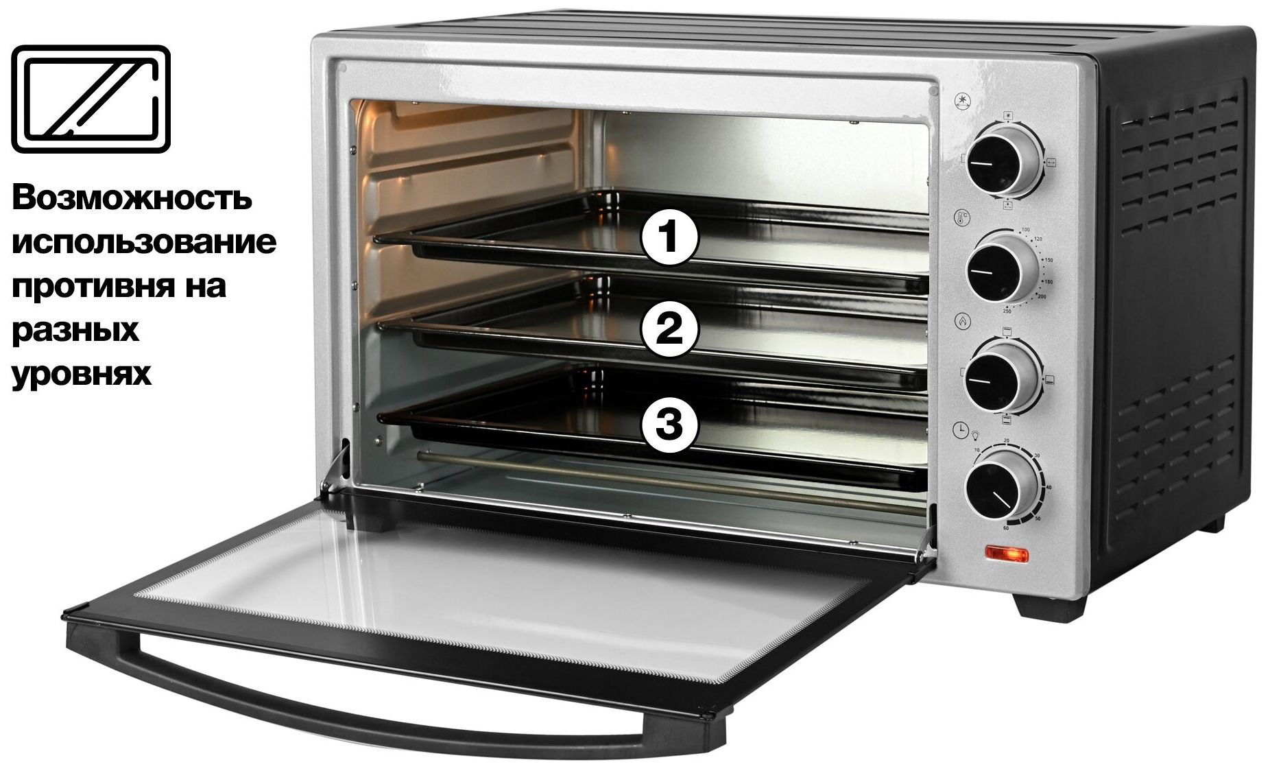 Управление — механическое. Таймер выключит модель в назначенное время и оповестит об окончании работы звуковым сигналом. Световые индикаторы показывают текущую и заданную температуру внутри. Подсветка позволяет отслеживать процесс приготовления, не открывая дверцу.