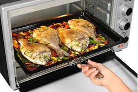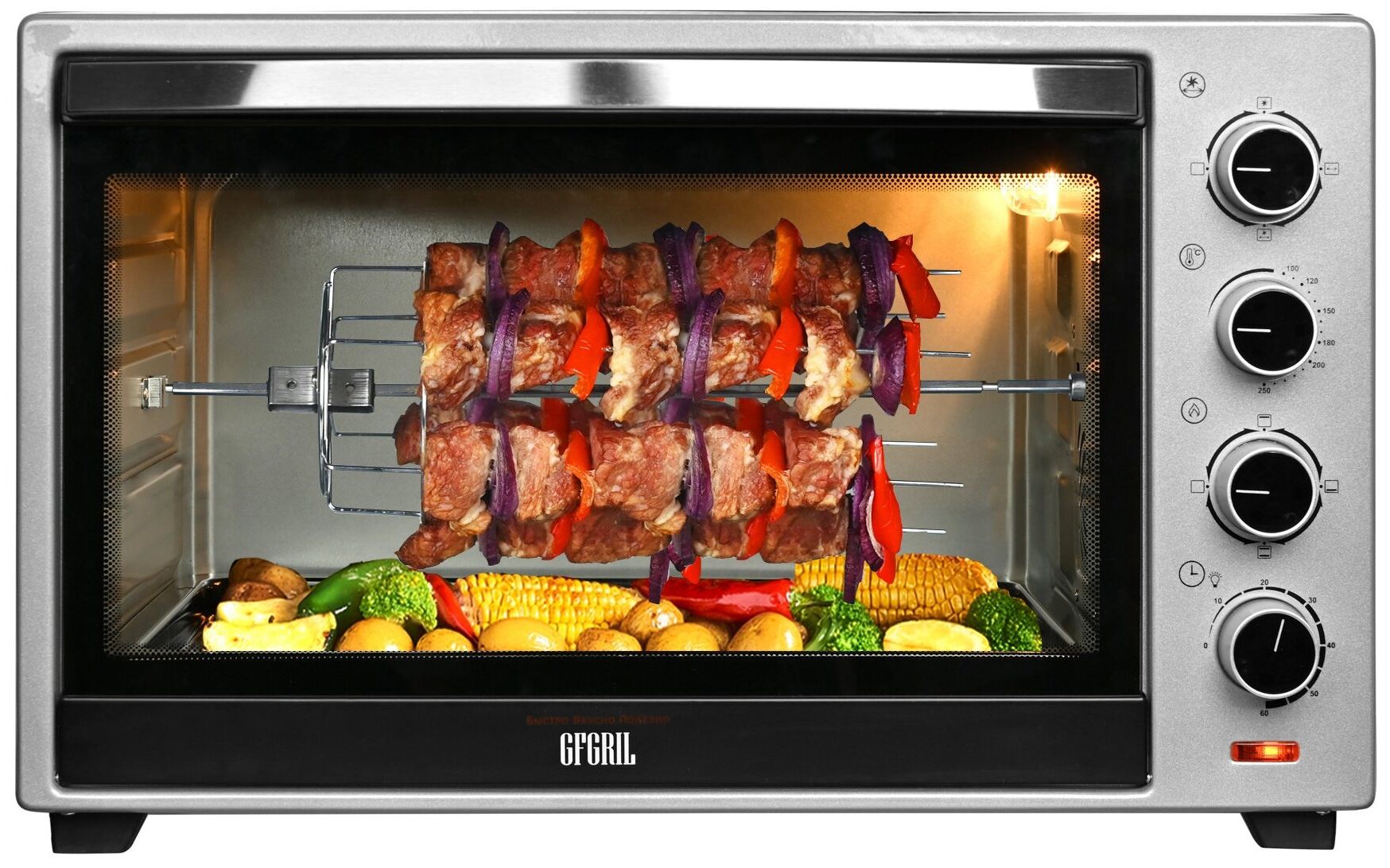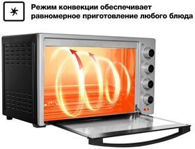 Мини-печь Gfgril GFO-60 мощностью 2000 Вт легко заменит духовку. В комплекте идут ухват, вертел, подставка для пиццы, решетка, плоский противень. Есть режимы конвекции и гриля.