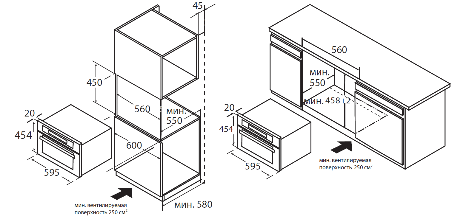 Габариты для встраивания (Д х Ш х В), мм: 560 х 550 х 450