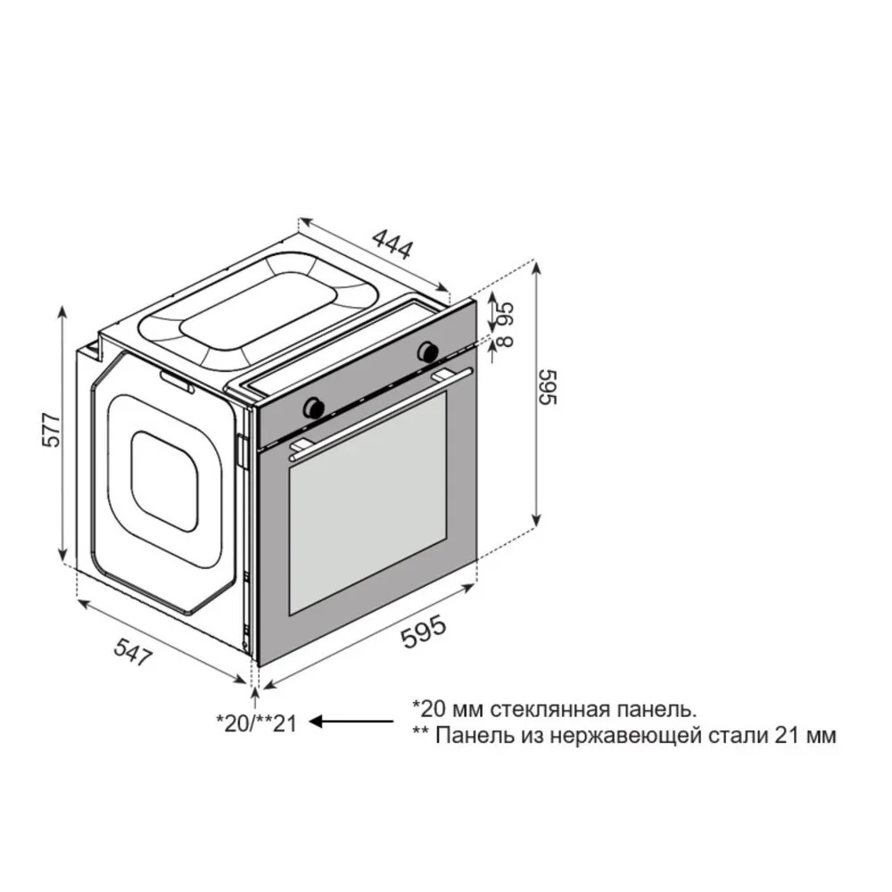 Съемная и полностью разборная дверца духовки.3-слойное стекло + усиленная теплоизоляция дверцы LOW-E. Панорамное внутреннее стекло