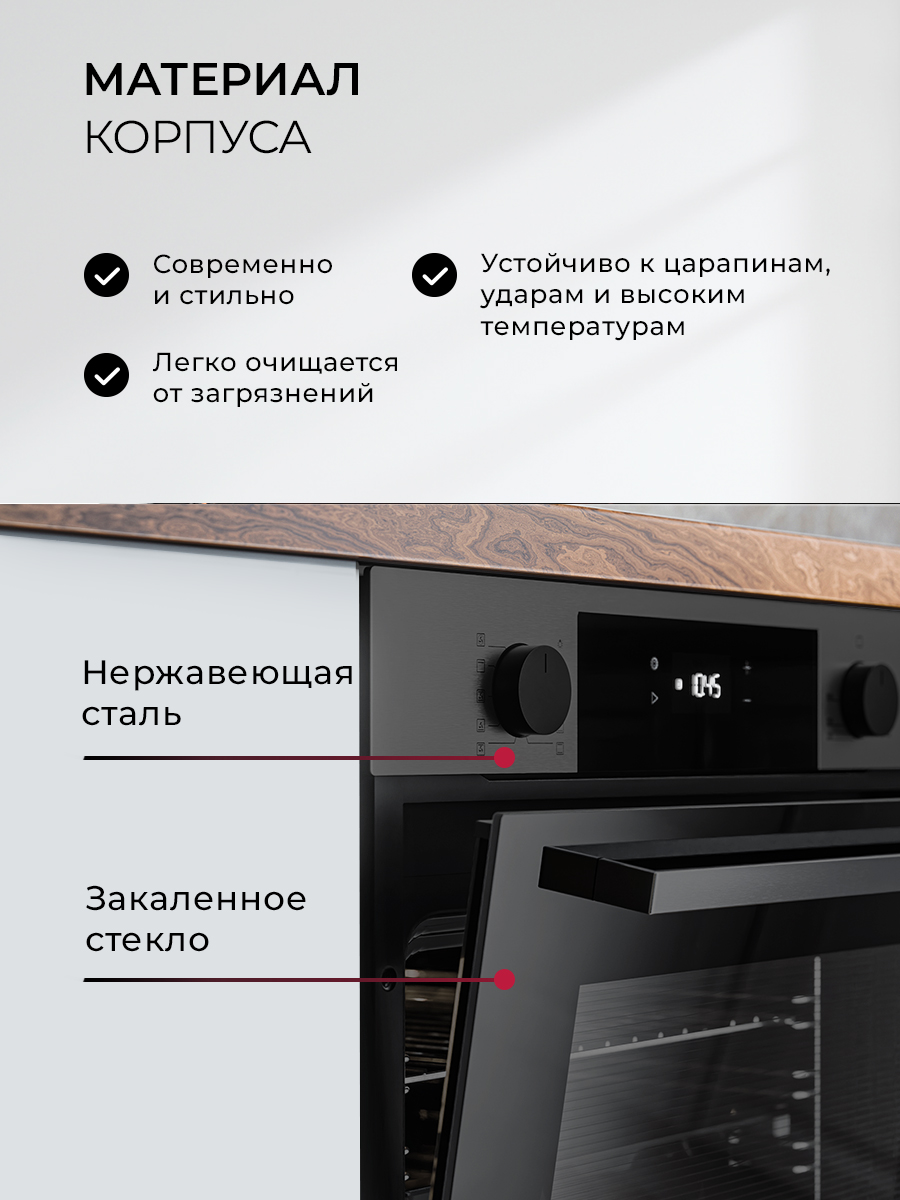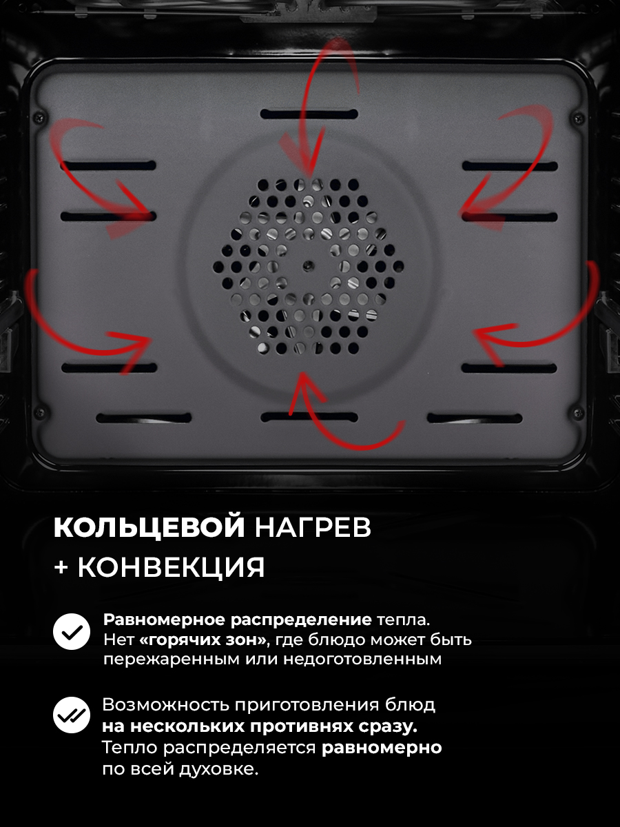 Верхний нагрев, Верхний нагрев с конвекцией, Гриль, Нижний нагрев, Нижний нагрев с конвекцией, Подсветка, Размораживание, Традиционный, Кольцевой нагрев с конвекцией, Традиционный нагрев + конвекция