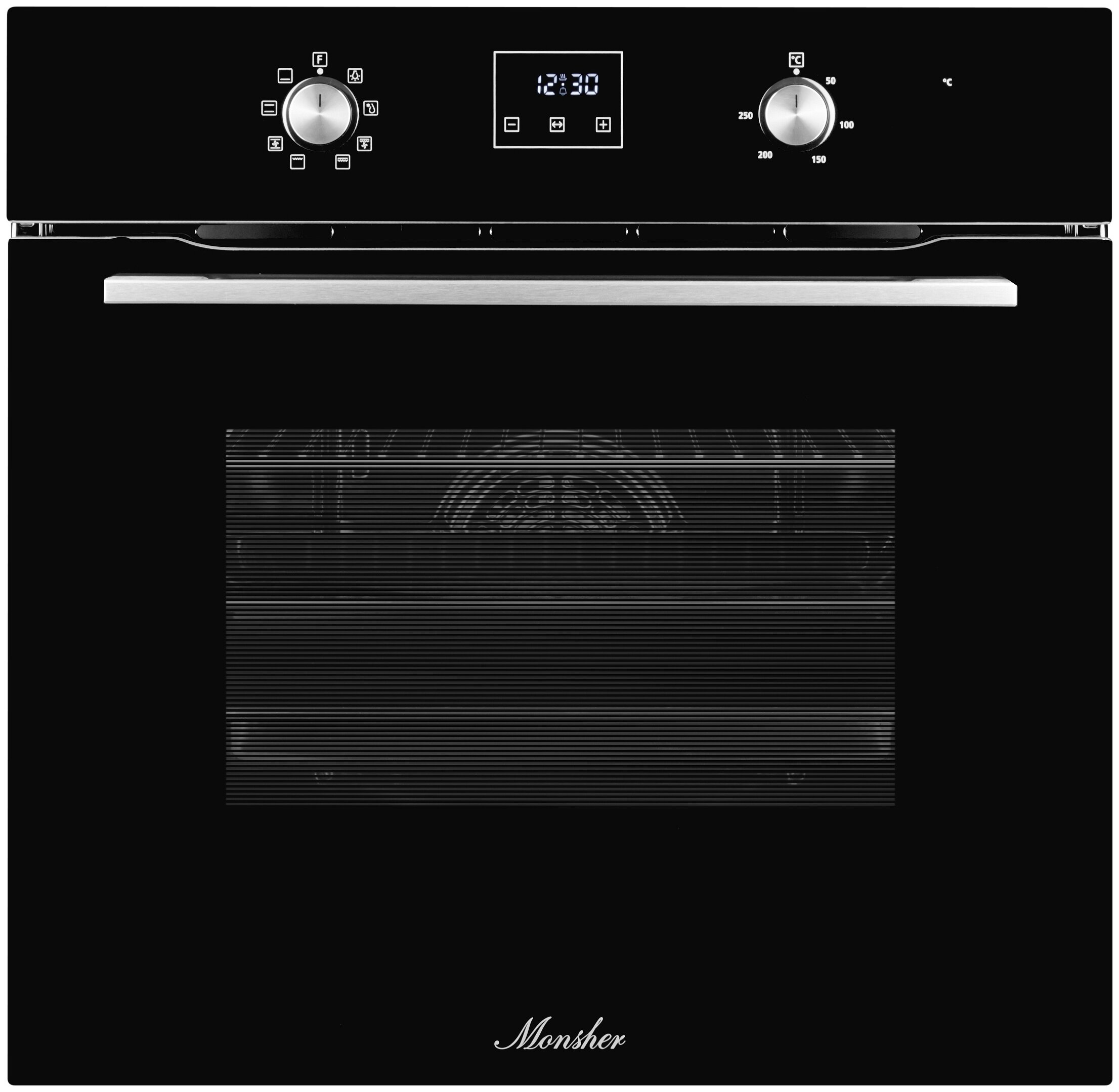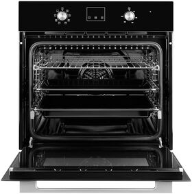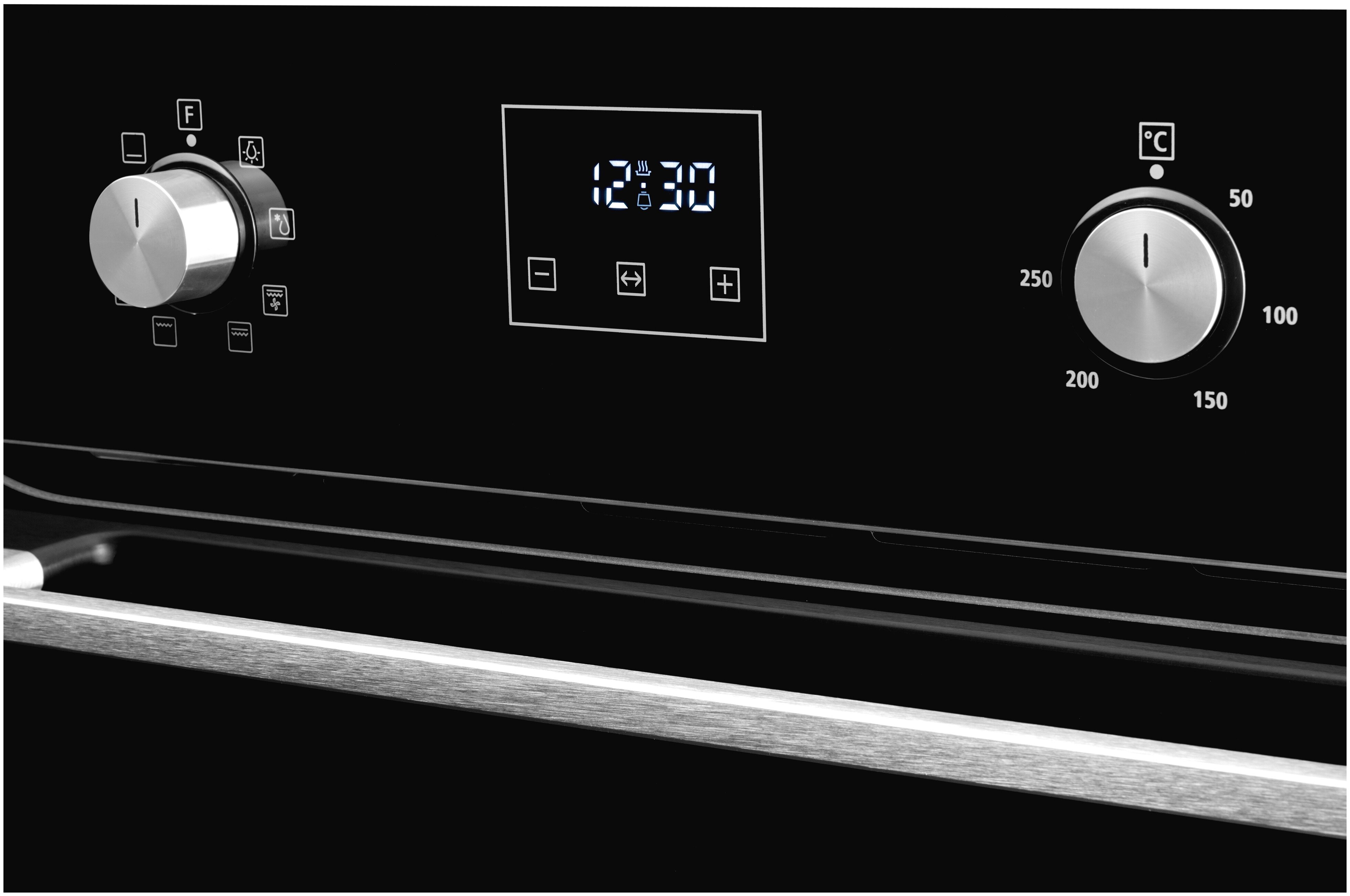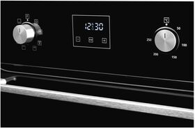 размер ниши для встраивания под столешницу (ВхШхГ) 600х560х570 мм; тип часов: электронные; традиционный нагрев с конвекцией; направляющие для противней хромированные, съемные; съемная дверца духового шкафа; съемное внутреннее стекло; фасад стеклянный; доводчик двери коллекция Hi-Tech