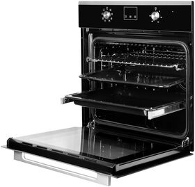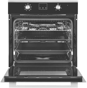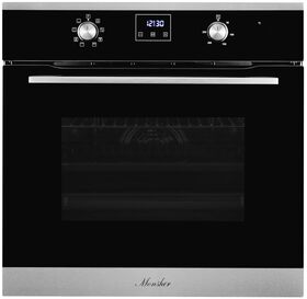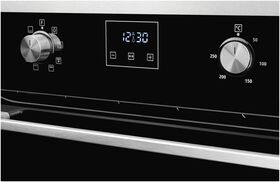 размер ниши для встраивания под столешницу (ВхШхГ) 600х560х570 мм; тип часов: электронные; традиционный нагрев с конвекцией; направляющие для противней хромированные, съемные; съемная дверца духового шкафа; съемное внутреннее стекло; фасад стеклянный; доводчик двери коллекция Hi-Tech