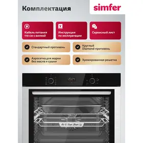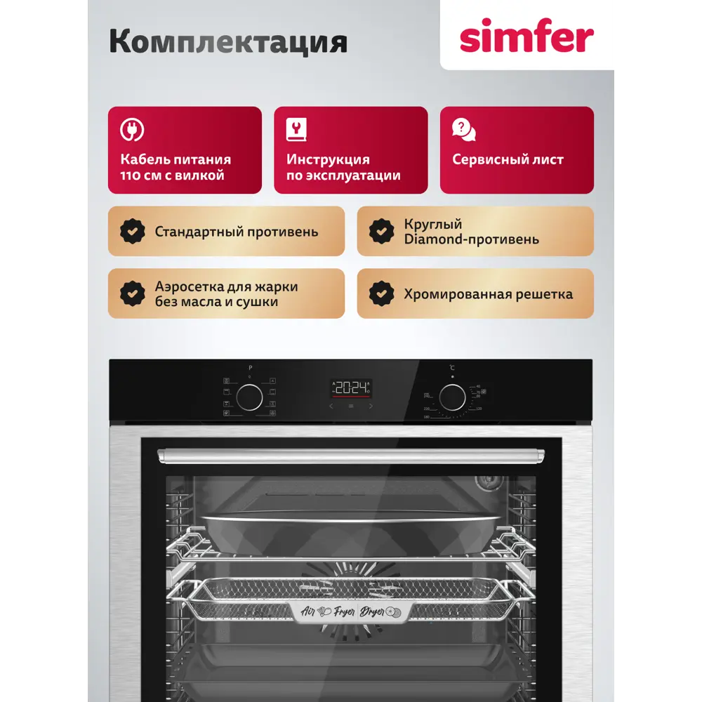 стандартный противень с антипригарным покрытием; хромированная решётка; круглый противень; инструкция по эксплуатации; гарантийный талон