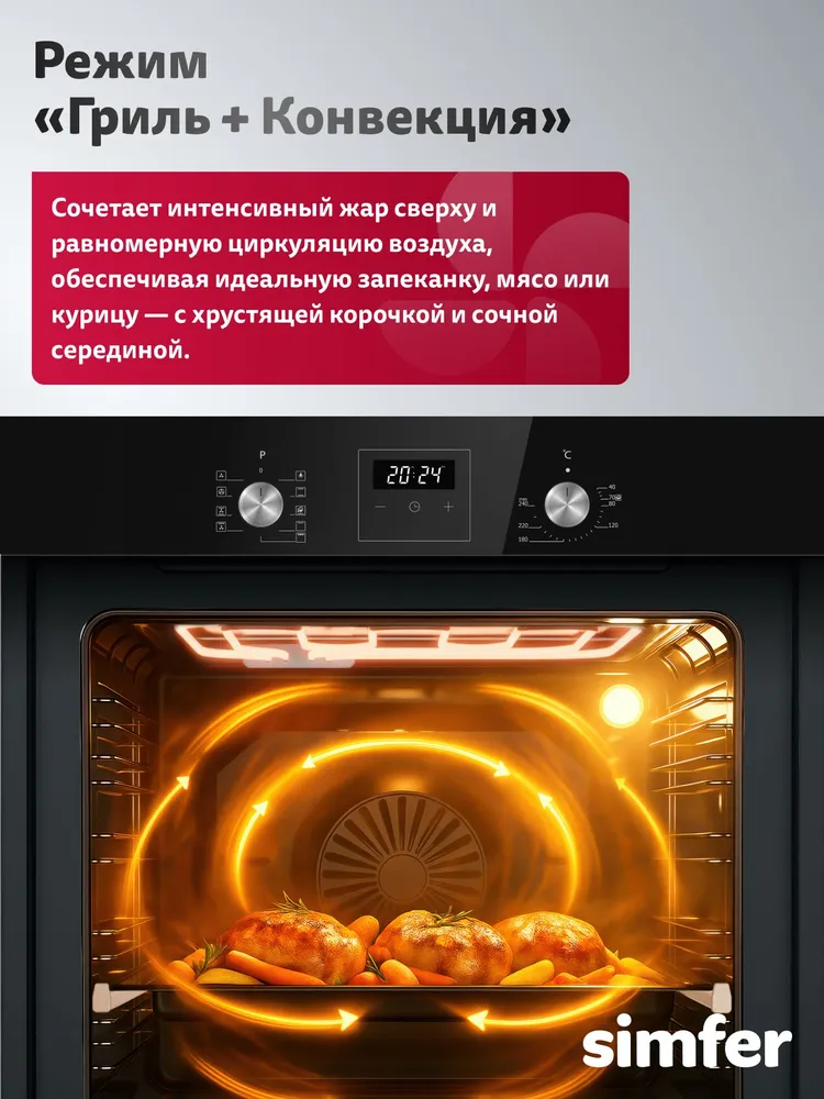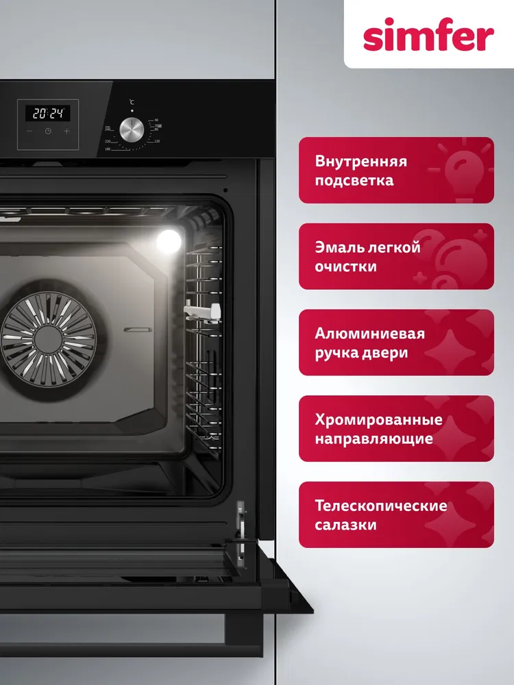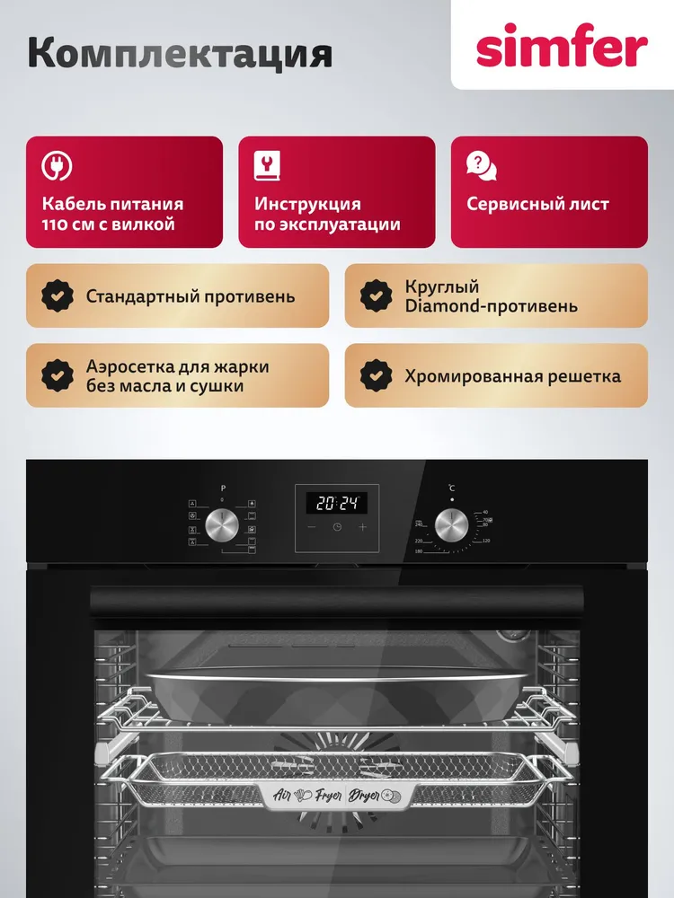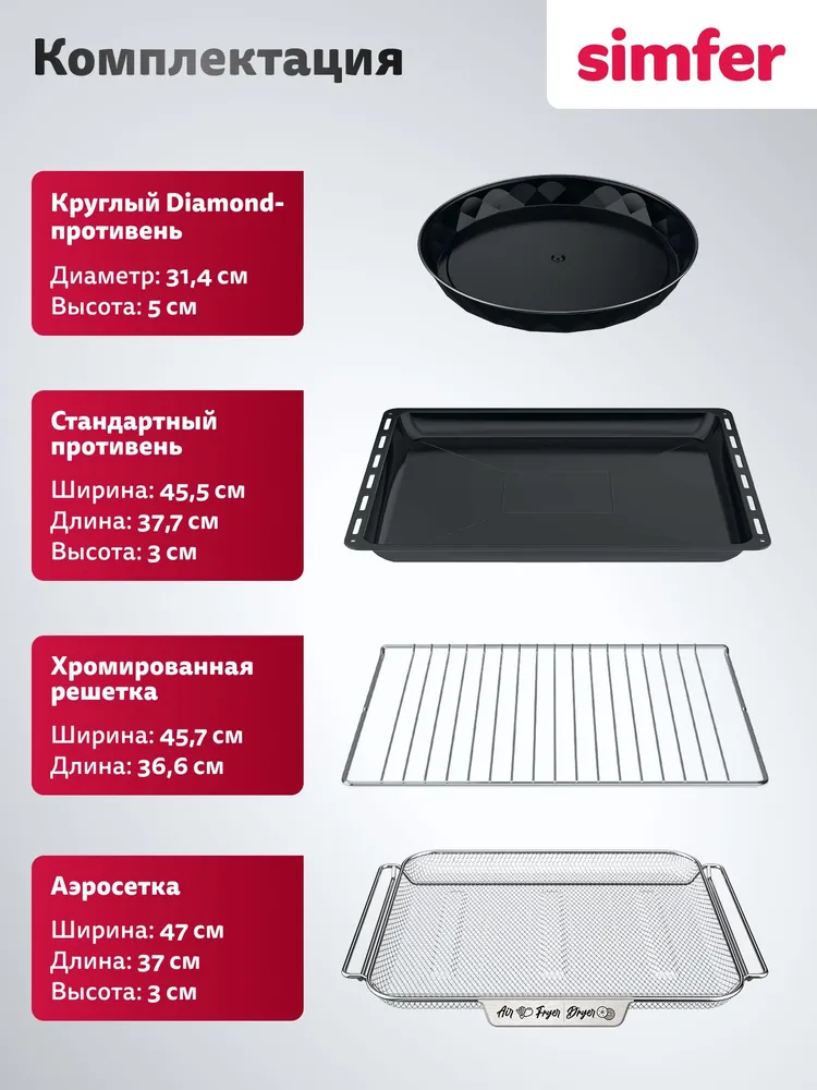 стандартный противень с антипригарным покрытием; хромированная решётка; круглый противень; инструкция по эксплуатации; гарантийный талон