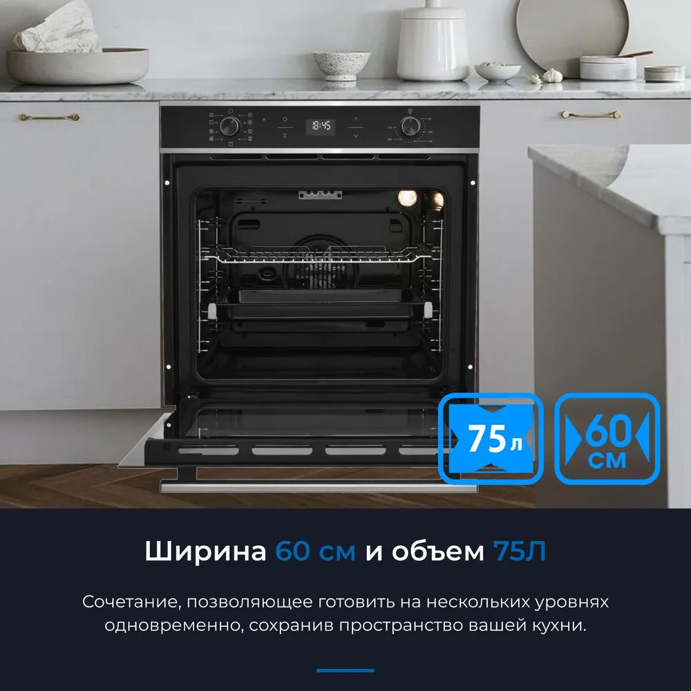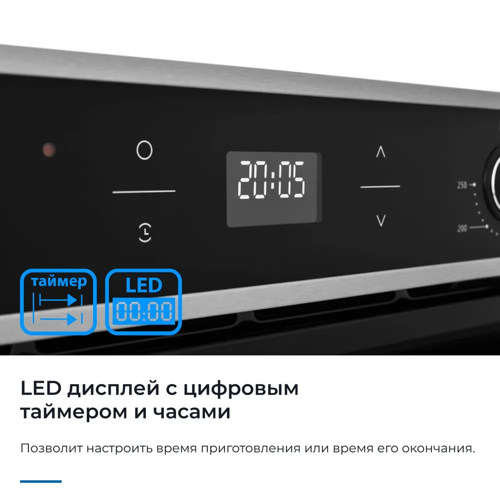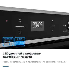 Особенности духовки, плиты: Хромированные направляющие, Вентилятор охлаждения, Дисплей, Встроенные часы, Двухуровневое приготовление, Доводчик дверцы духовки
