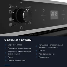 Режимы работы: Гриль + конвекция, Верхний + нижний нагрев, Верхний нагрев, Нижний нагрев + Турбо (Пицца), Кольцевой элемент + вентилятор + выпариватель, Размораживание, Гриль