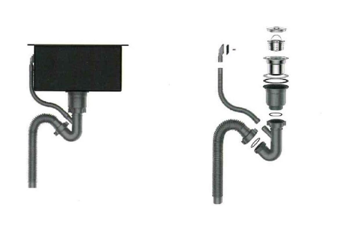 Мойка укомплектована итальянским сифоном с прямоугольным переливом WISENT GER010 и гофротрубой.