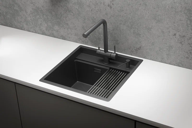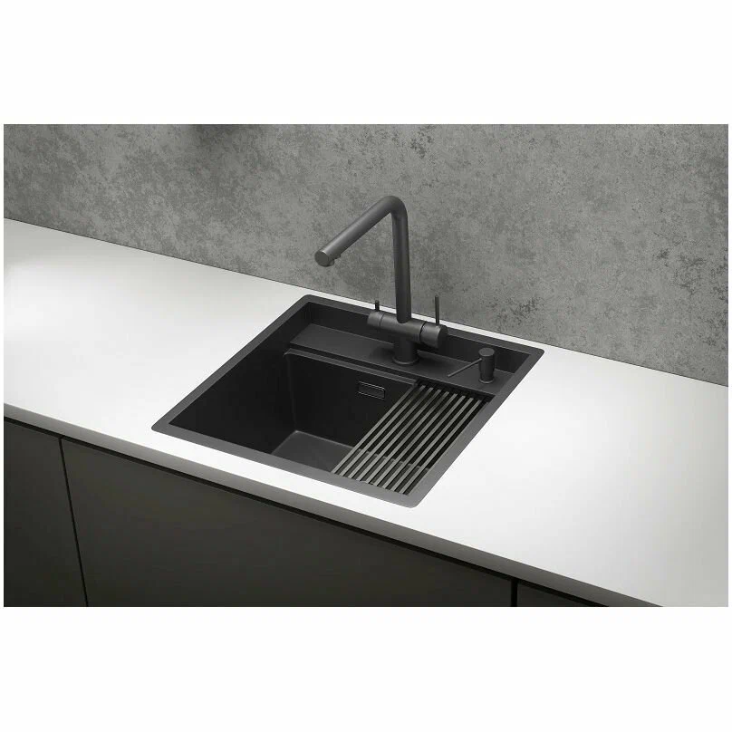 В комплекте мойка, сифон, комплект креплений, дозатор для жидкого мыла (нерж) и ролл-мат