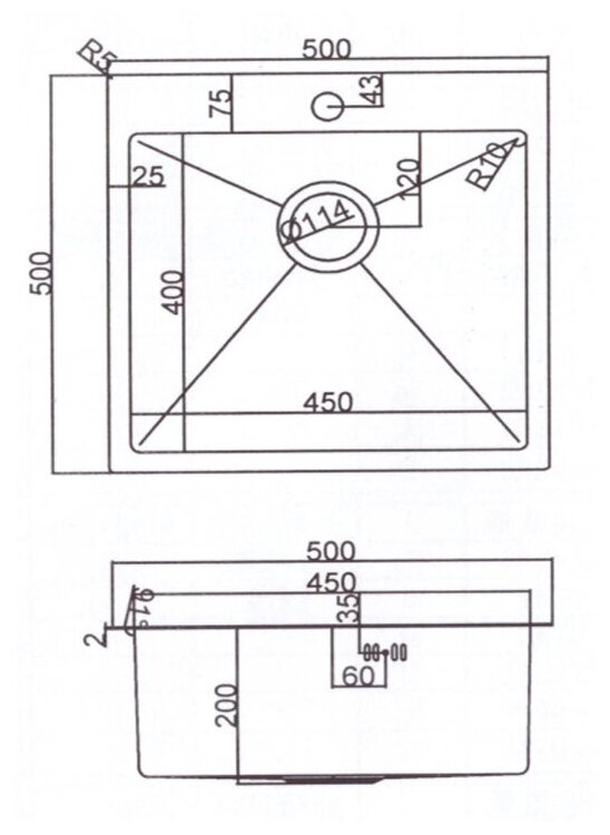 Мойка имеет размеры 500 x 500 мм и R5 радиус закругления. Внутренние углы с R10 радиусом закругления.