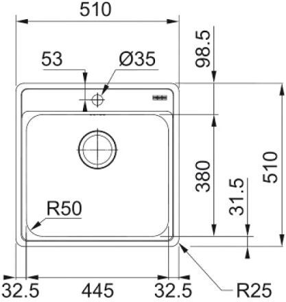 Мойка для кухни из нержавеющей стали Франке Bell BCX 210-51 TL шириной 51 сантиметр. Установка на столешницу и вровень со столешницей. Полка с одним отверстием для смесителя.