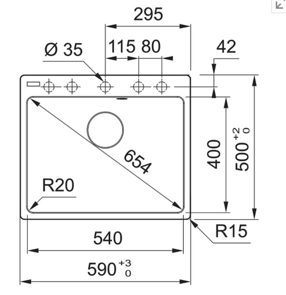 • Вырез для монтажа сверху 570 х 480 см, R15