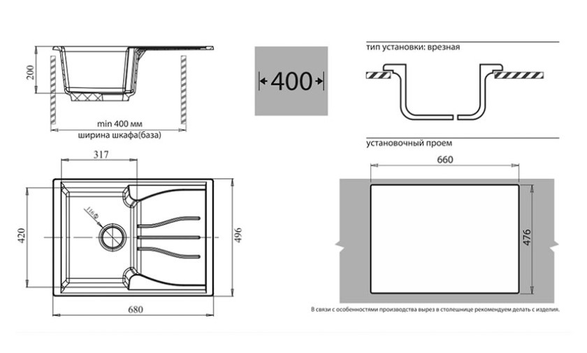 В связи с особенностями литьевого производства размеры изделий могут варьироваться, поэтому вырез в столешнице рекомендуется делать непосредственно с изделия.