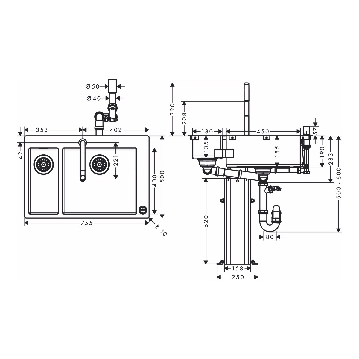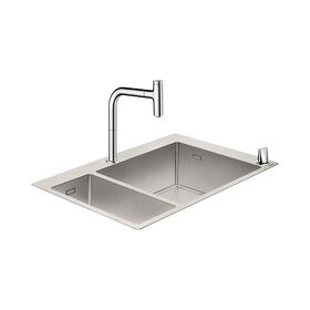 Cостоит из: встраиваемая мойка, кухонный смеситель, однорычажный, на 2 отверстия, устройство управления, корпус для шланга, система слива с ручным управлением м