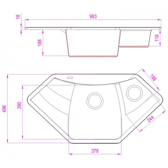 Размер чаши 395 х 360 х 200 мм, 190 х 160 х 130мм
