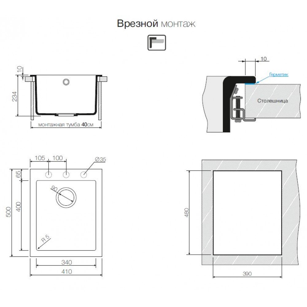 Тип монтажа - врезной, мойка устанавливается сверху столешницы.