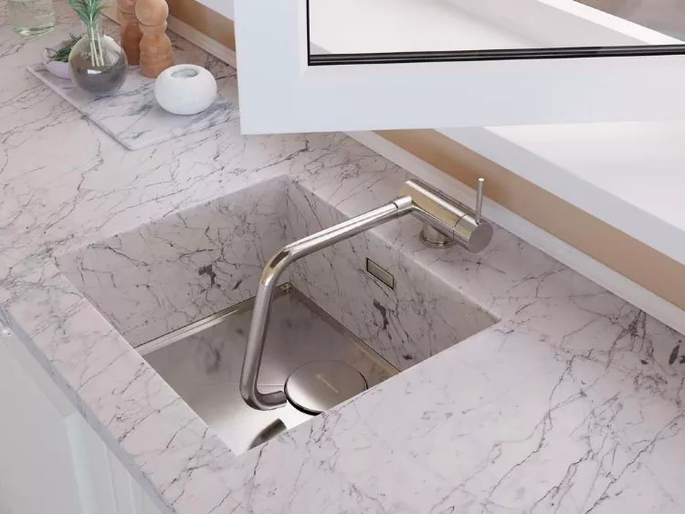 Мойка Omoikiri KASEN 53-INT с интегрированным типом монтажа. Столешница из натурального или искусственного камня переходит в стенки изделия, а дно при этом остается из нержавеющей стали.